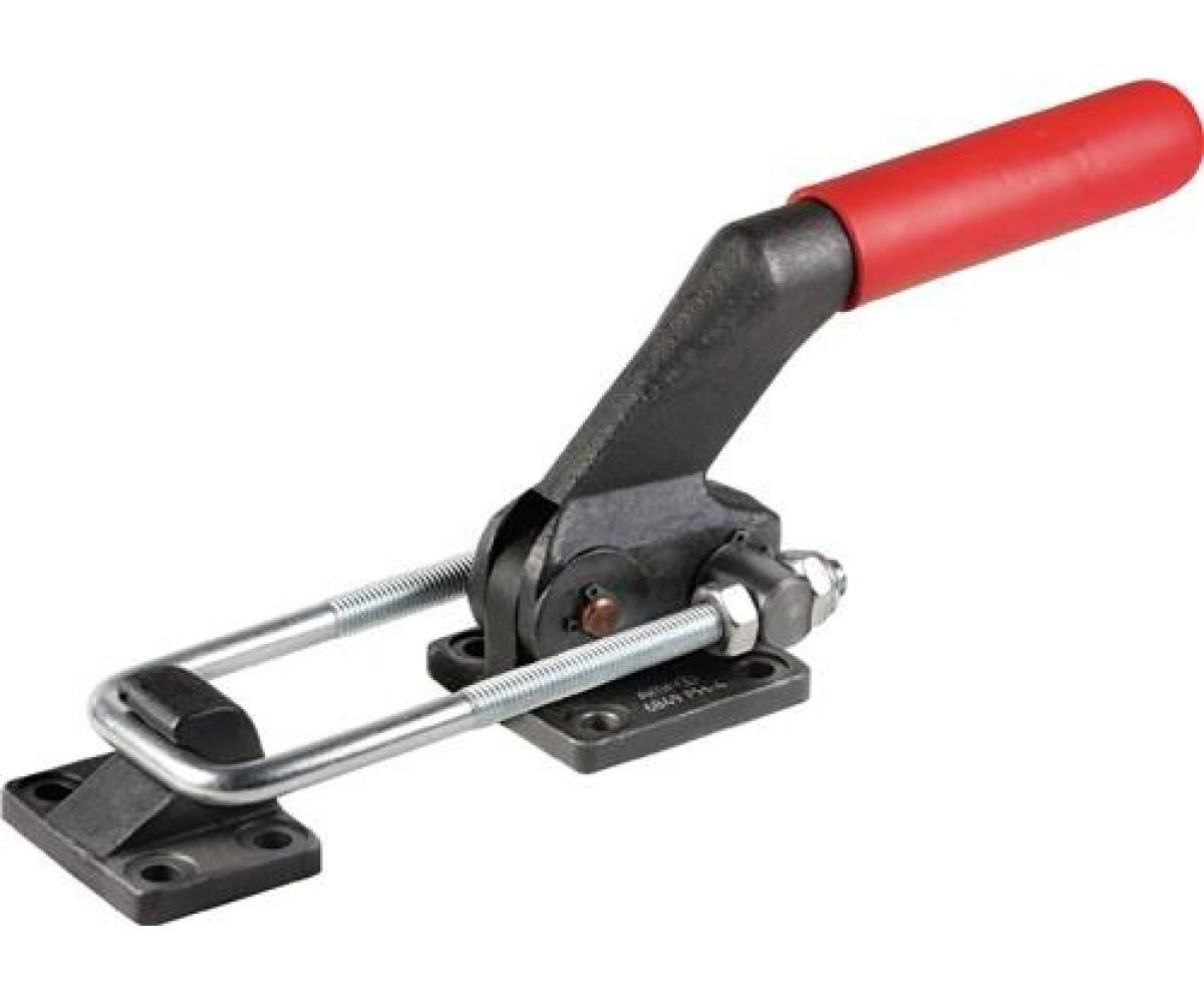 schwer · für hohe Haltekräfte · Bolzen gehärtet und geschliffen, dauerhaft gefettet, mit Sicherungsringen in Lagerbuchsen montiert · der Spannbolzen ist mit Sicherungsringen mittig positioniert · Fuß, Hebelarm und Gegenhalter sind aus Stahlguss, brüniert · Spannbügel, Spannbolzen und Muttern sind vergütet und verzinkt