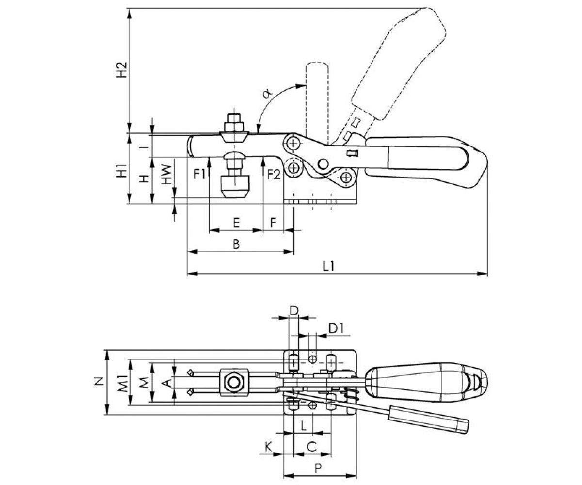 Weitere technische Eigenschaften · C: 41mm · D: 8,5mm · a: 90° · Andrückschraube: M8 x 65 · HW min.: -4mm · L1: 287mm · F1: 2kN · L: 20,5mm · Bauart: waagrechter Fuß · F: 27mm · P: 57mm · K: 8mm · A: 10mm · HW max.: 24mm · H1: 75mm · H2: 126,5mm · M1: 43mm · I: 20mm · F2: 3kN · B: 113mm · E: 63mm · M: 29-43mm · H: 45mm · N: 58mm · D1: 8,5mm · Waagrechtspanner Nr.6830S · Gr.4 waagrechter Fuß · Sicherheitsverriegelung ·