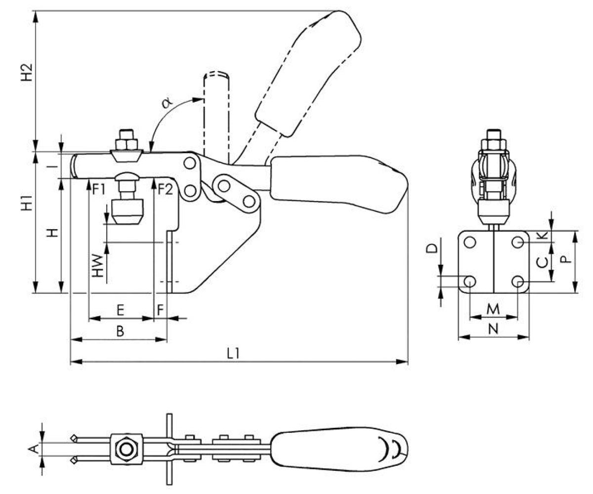 Weitere technische Eigenschaften · C: 13,5mm · D: 5,2mm · a: 90° · Andrückschraube: M5 x 30 · L1: 120mm · F1: 0,8kN · Gesamthöhe: 68mm · Bauart: Winkelfuß · F: 4mm · P: 28mm · K: 8mm · A: 5mm · H1: 68mm · H2: 49mm · I: 10mm · F2: 1,1kN · B: 32mm · E: 18,5mm · M: 19mm · H: 57mm · N: 31mm · Gesamtlänge: 120mm · Waagrechtspanner Nr.6833 · Gr.1 Winkelfuß AMF ·