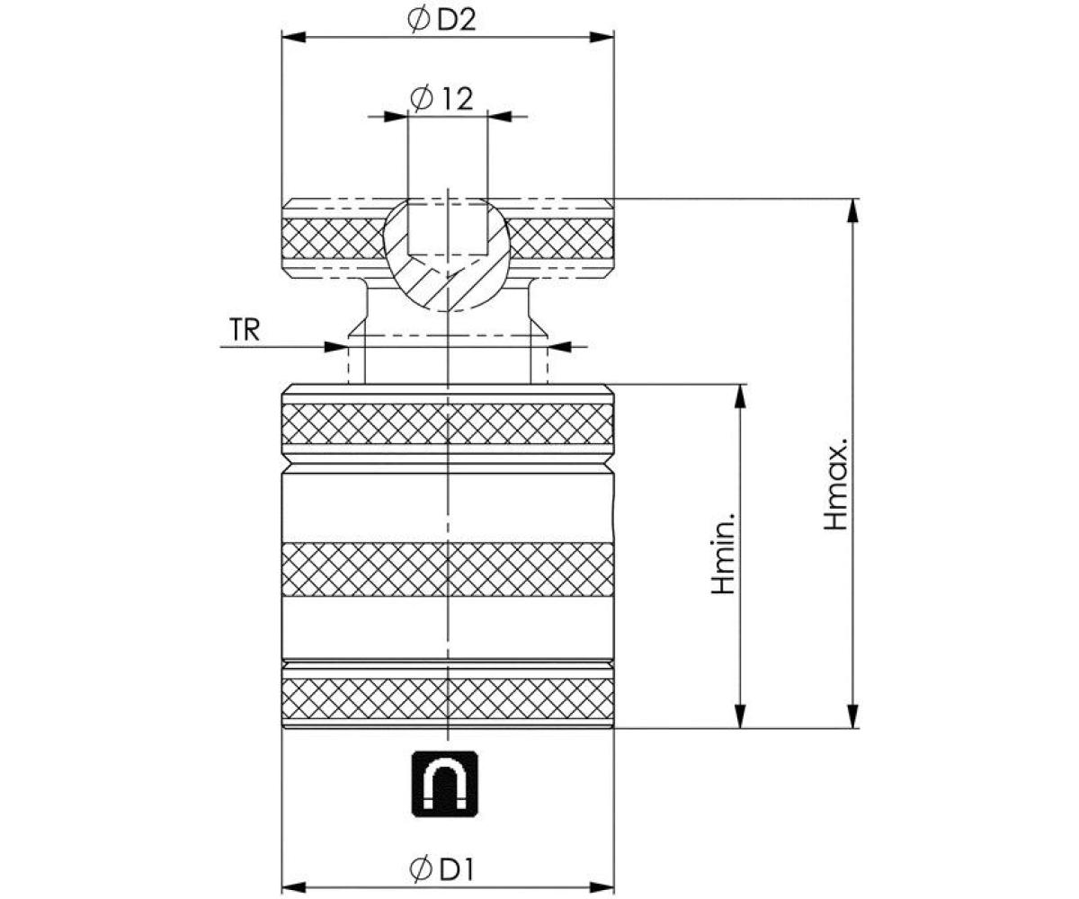 Weitere technische Eigenschaften · Tragfähigkeit max.: 100kN · Zentrierloch-Ø: 12mm · H max.: 110mm · D2: 50mm · TR: 30 x 4mm · H min.: 80mm · D3: 55mm · D1: 50mm · Schraubbock Nr.6400M · Gr.110 m.flacher Auflage · u.Magnetfuß H.80-110mm ·
