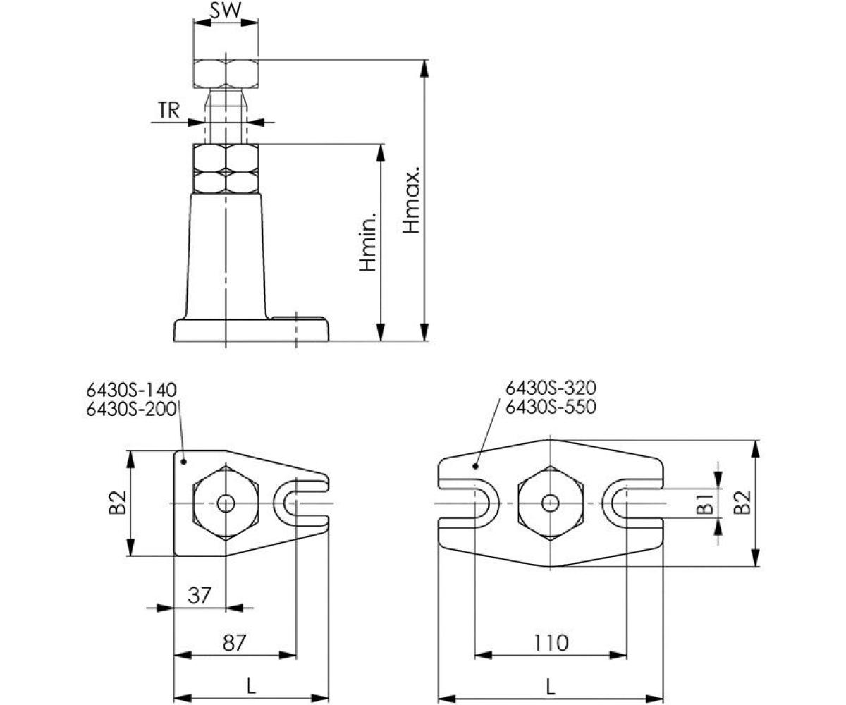 Weitere technische Eigenschaften · B1: 22mm · B2: 90mm · Tragfähigkeit max.: 25kN · Zentrierloch-Ø: 12mm · H max.: 550mm · L: 160mm · TR: 30 x 6mm · H min.: 320mm · Schlüsselweite: 46mm · Schraubbock Nr.6430S · Atlas Gr.550 · m.Gegenmutter H.320-550mm ·