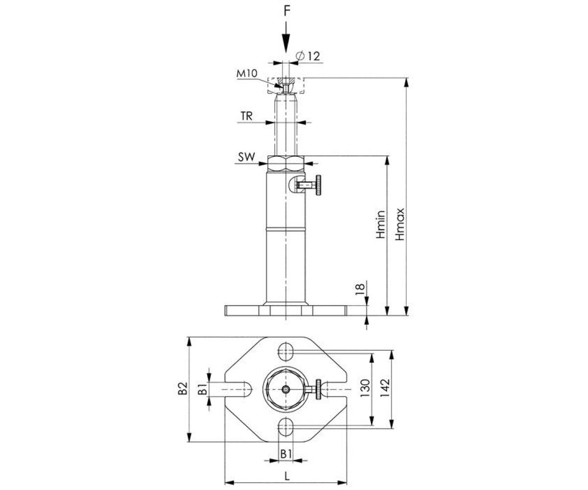 Weitere technische Eigenschaften · B1: 26mm · B2: 190mm · Tragfähigkeit max.: 40kN · Zentrierloch-Ø: 12mm · H max.: 1250mm · L: 220mm · TR: 40 x 7mm · H min.: 710mm · Schlüsselweite: 65mm · Schraubbock Nr.6435S · Gr.1250 schwer · H.710-1250mm AMF ·