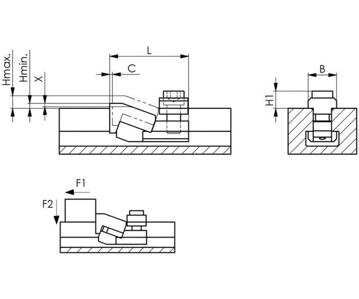 Weitere technische Eigenschaften · b: 25mm · l: 68mm · h: max. 17,0 mm / min. 2,5 mm · Flachspanner · Mini-Bulle,Nr.6492 T-Nut · 16mm AMF · h = bei maximaler T-Nutentiefe nach DIN 650. Zur Erreichung niedriger Spannhöhen bei minimaler Nutentiefe kann das Spannstück abgeschliffen werden. Lieferung mit Befestigungsschrauben ISO 4762 (8.8) und Sechskantschraubendreher ISO 2936 ·