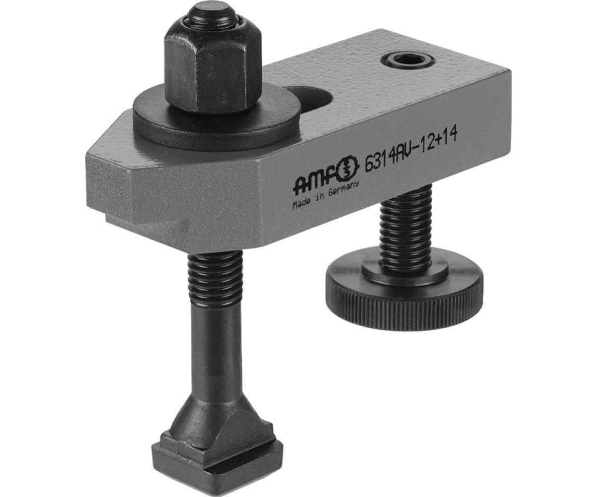 Hinweis: Maß H: Abhängig von Nutentiefe nach DIN 650, sowie Einschraublänge der Mutter. Die niedrigste Spannhöhe wird durch Umdrehen des Spanneisens erreicht. Spanneisen ohne Spannschraube sind in den Größen 12 und 14, 16 und 18 sowie 20 und 22 je eine Größe.