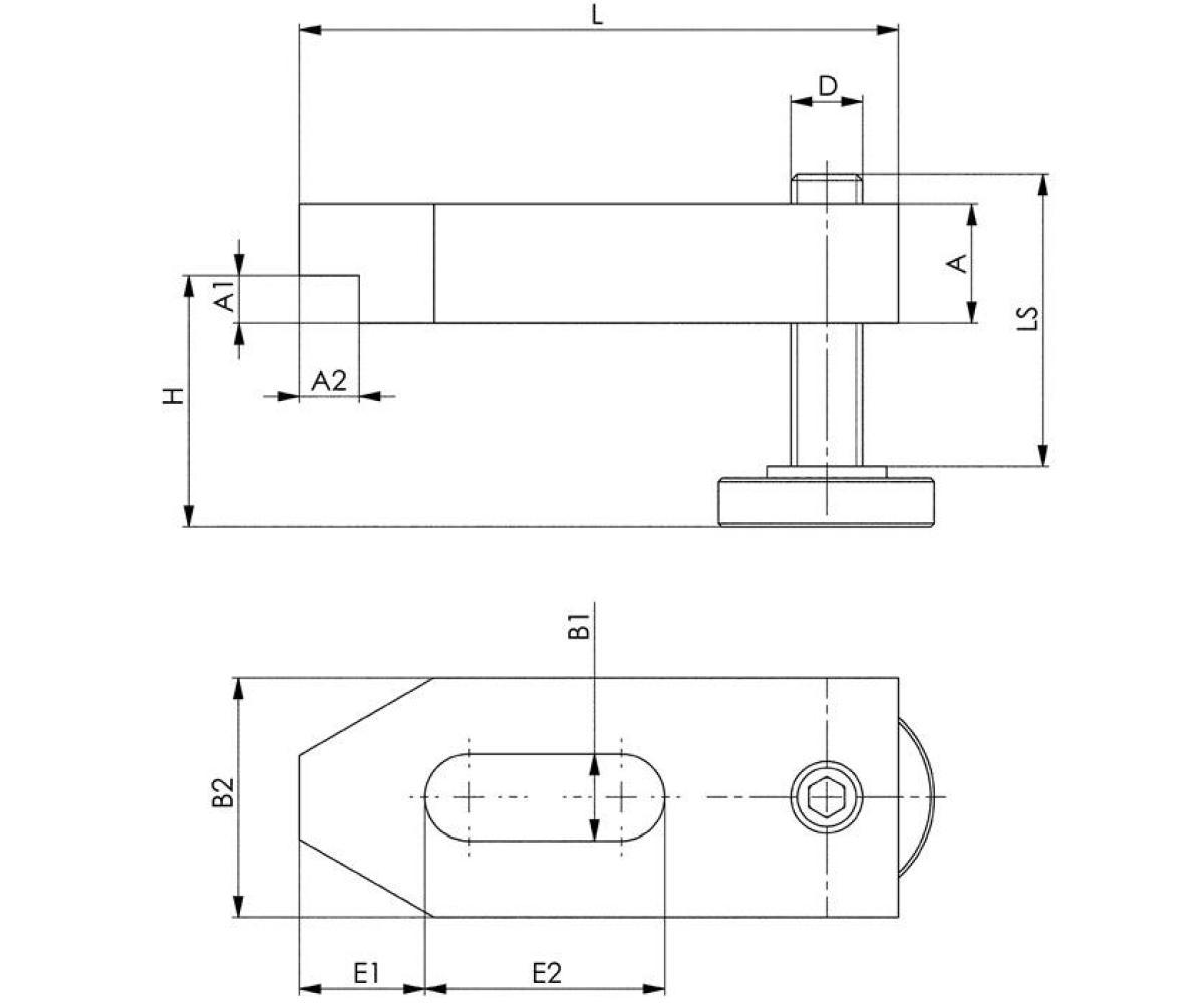 Weitere technische Eigenschaften · Breite: 60 mm · Länge: 160 mm · A: 30mm · B1: 22mm · B2: 60mm · E2: 60mm · D: M20 · E1: 30mm · Gewicht: 2800g · A2: 15mm · ähnl. DIN 6314 B1 x L: 22 x 160mm · L: 160mm · Stärke: 30 mm · LS: 69mm · A1: 12mm · Schlitzbreite: 22 mm · H: 16 - 77mm · Spanneisen Nr.6314AV · f.T-Nut 20mm L.160mm · Spannschraube ·