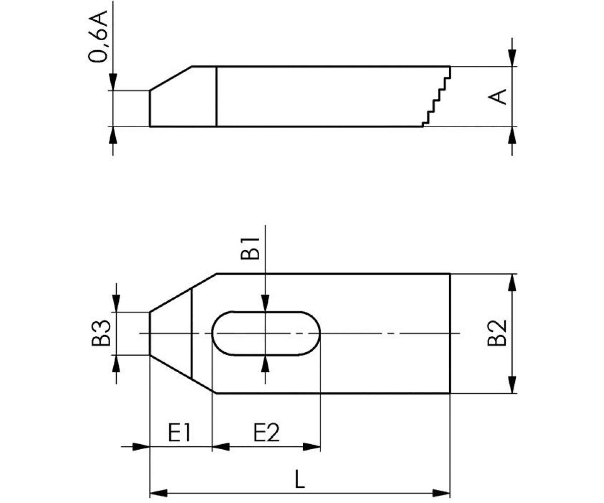 Weitere technische Eigenschaften · Breite: 20 mm · Länge: 80 mm · A: 10mm · B1: 6,6mm · B2: 20mm · E2: 45mm · E1: 10mm · Gewicht: 90g · L: 80mm · Stärke: 10 mm · Schlitzbreite: 6,6 mm · B3: 8mm · Spanneisen Nr.6314Z · f.T-Nut 6mm L.80mm AMF ·