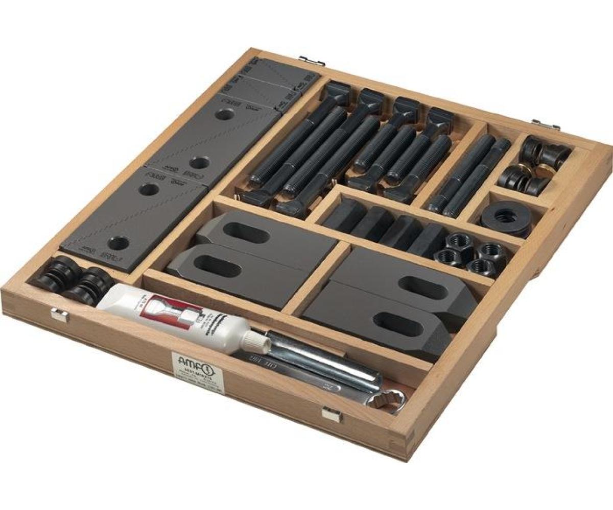 Weitere technische Eigenschaften · Inhalt: 45 teilig · Sechskantmuttern: 4 x M20 · Universalspannunterlagen: 4 x Gr. 2, 4 x Gr. 3 · Schraubenpaste: ja · Ringmaulschlüssel: 1 x Gr. 24 x 24mm · Verlängerungsmuttern: 4 x M20 · Federnde Spanneisenhalter: 4 x Gr. 3 · Spanneisen mit Treppenzähnen: 4 x Gr. 18 x 125mm · Kegelpfannen Form: G 6 x M20 · Nutenräumer: 1 x Gr. 14 - 20mm · Spannwerkzeugsortiment · Nr.6531 M16 x 16mm · 45tlg.AMF ·
