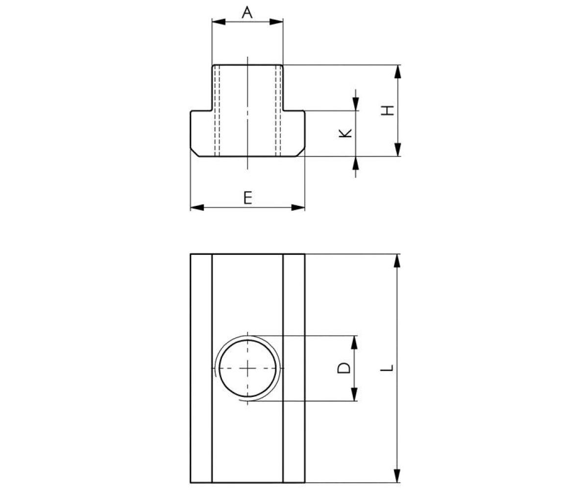 Weitere technische Eigenschaften · A: 19,7mm · D: M18 · L: 64mm · K: 12mm · E: 32mm · H: 24mm · T-Nutenstein Nr.508L · T-Nut 20mm M18 lang AMF ·