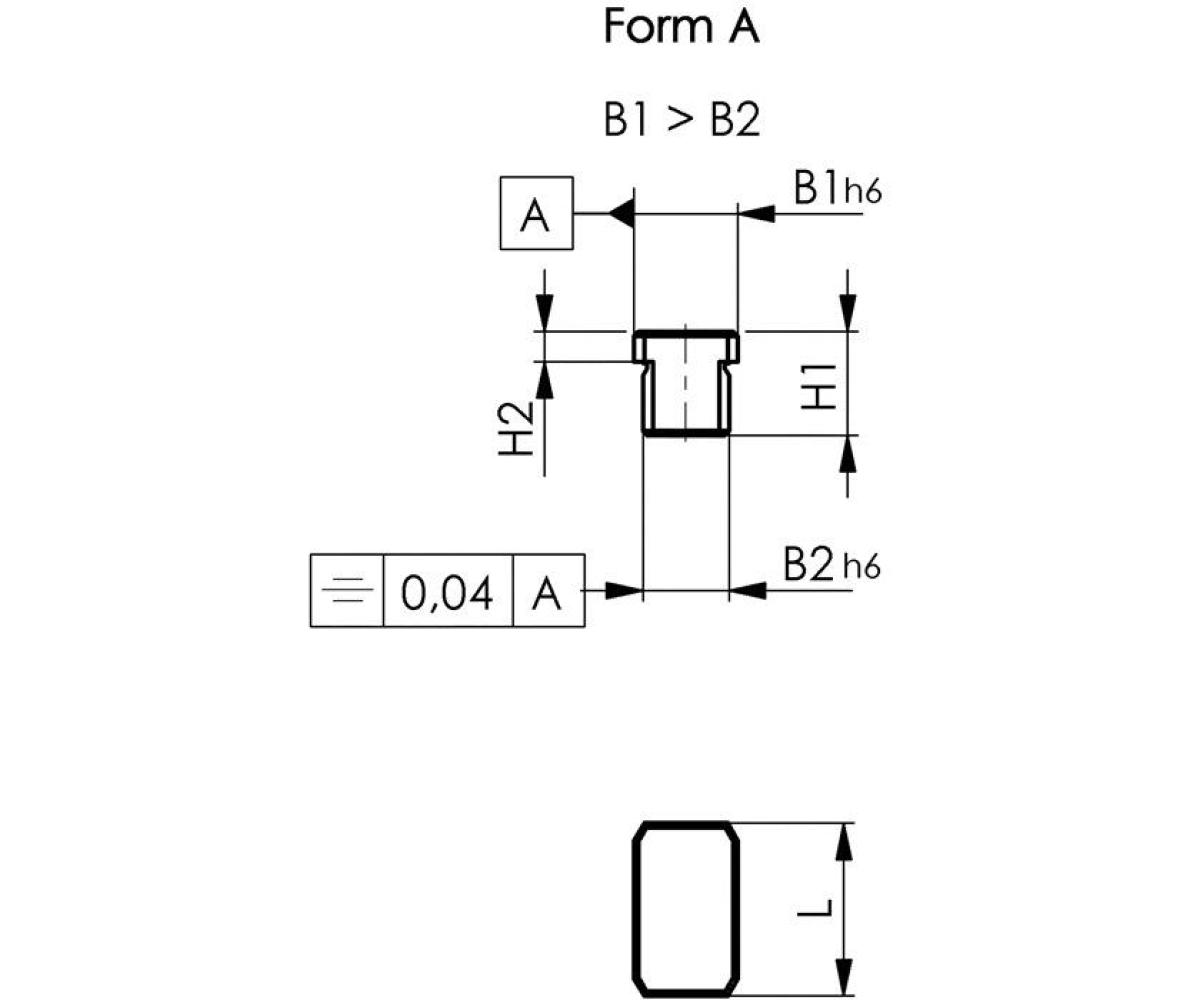 Weitere technische Eigenschaften · Nennmaß der Nute bei Maschine: 10mm · H1: 12mm · Nennmaß der Nute bei Vorrichtung: 12mm · Einsatzempfehlung: lose sitzend · H2: 3,6mm · L: 20mm · Form: A · Nutenstein DIN 6323 · Nennmaß der Nut 10/12mm · Form A lose sitzend AMF ·