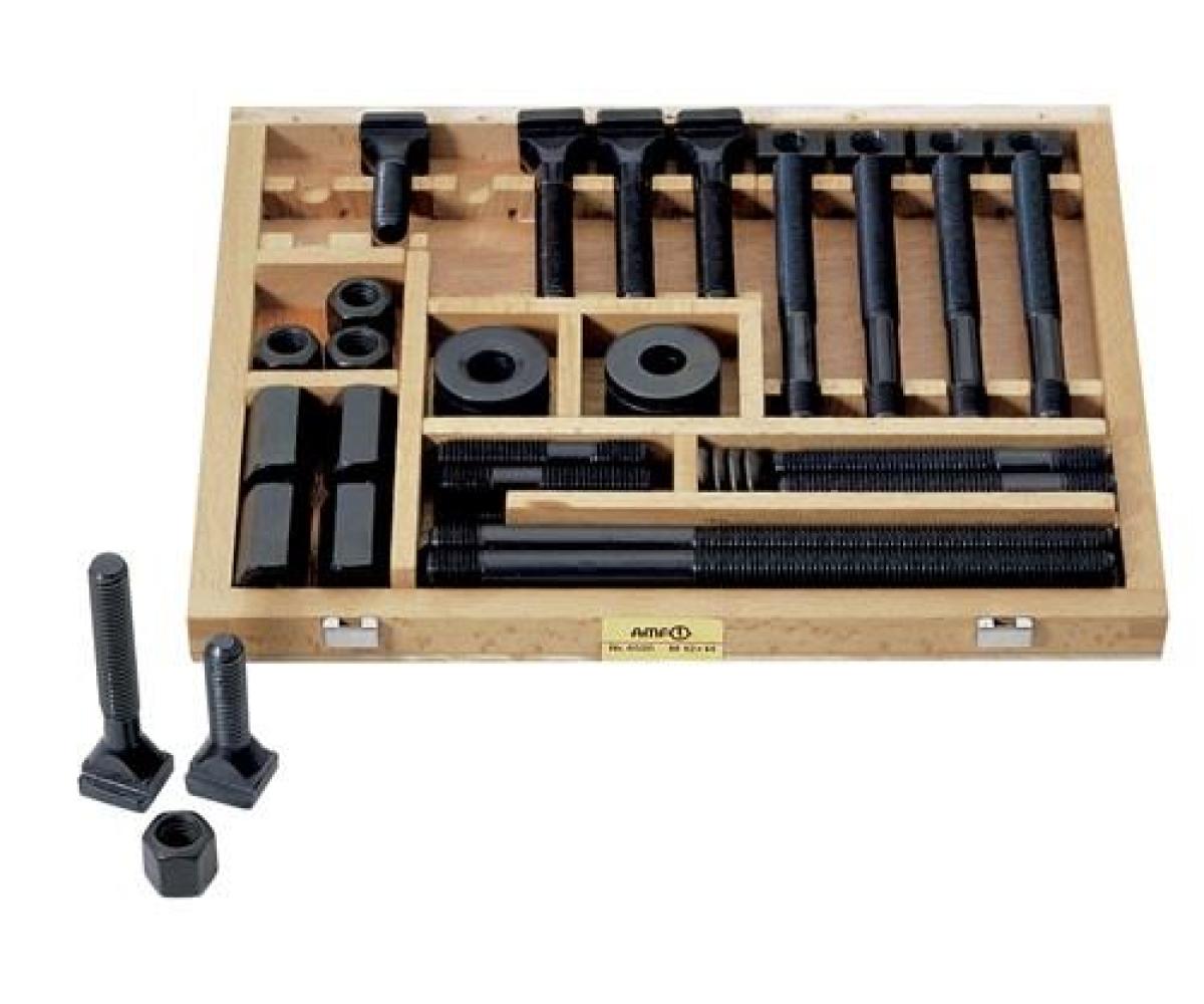 Inhalt: T-Nutenschrauben DIN 787 Stiftschrauben DIN 6379 Sechskantmuttern DIN 6330 B Verlängerungsmuttern Nr. 6334 Kugelscheiben + Kegelpfannen DIN 6319 C + G Scheiben DIN 6340Technische Daten