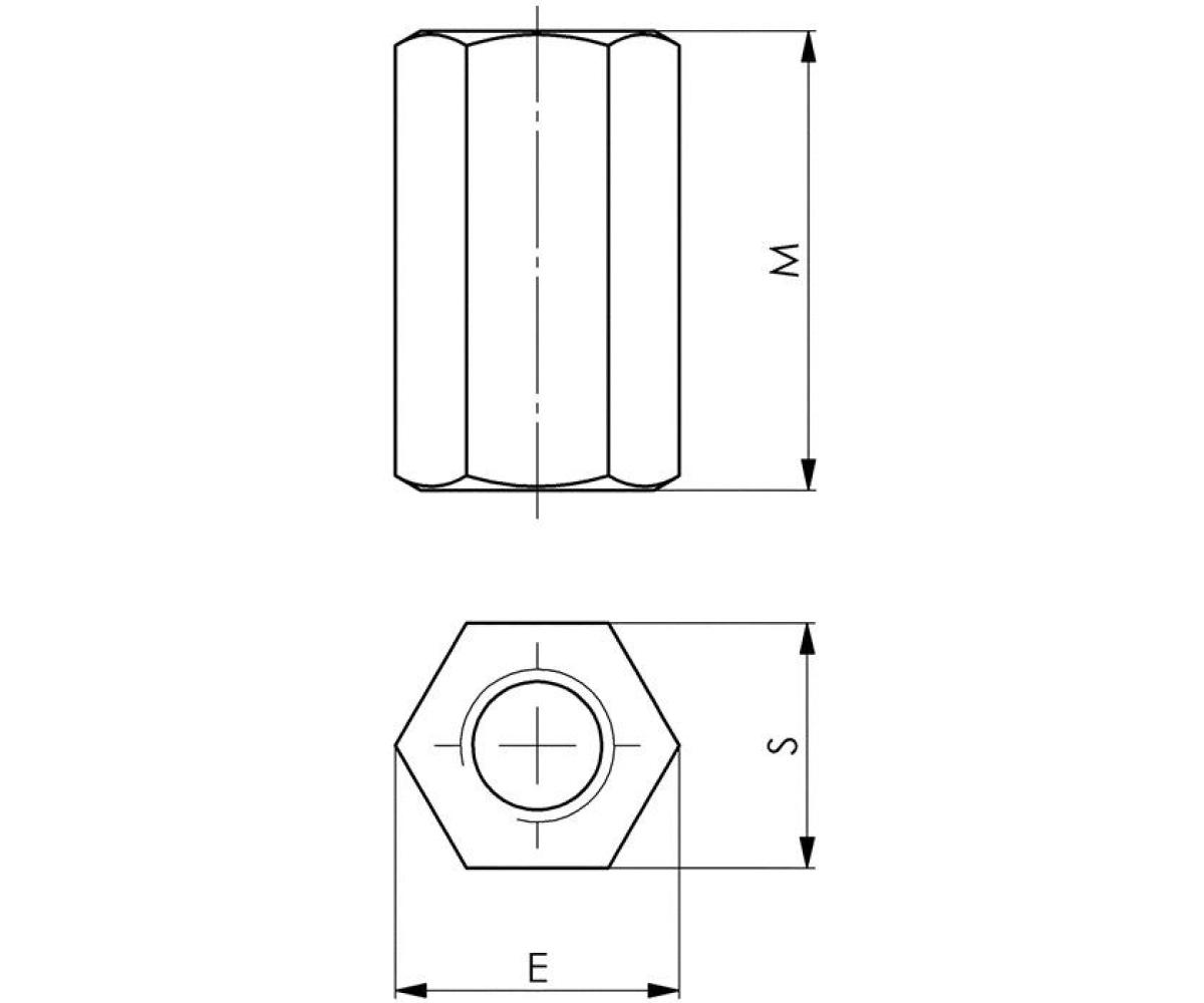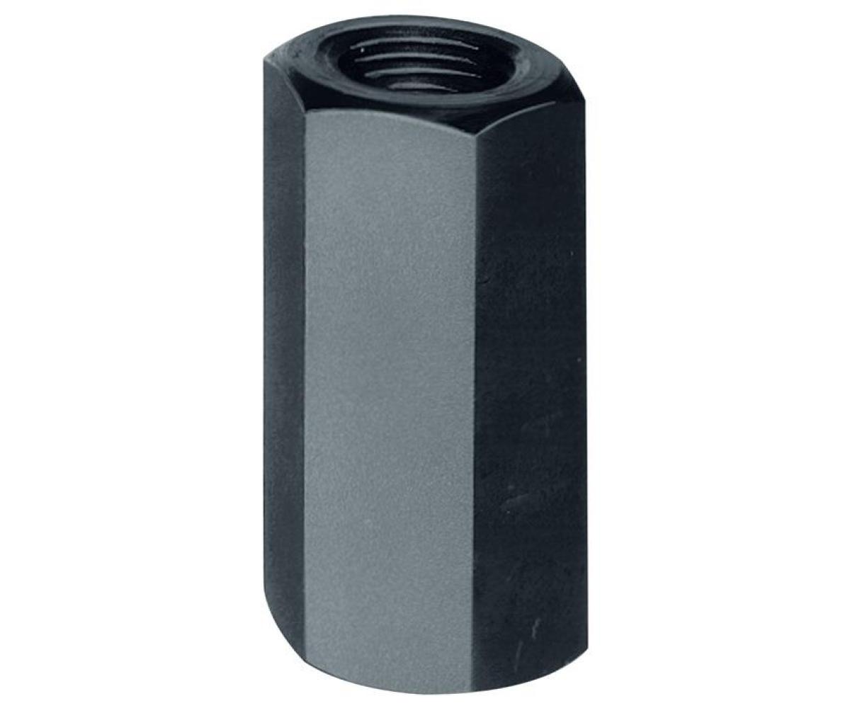 Anwendung: Die Verlängerungsmutter dient als beliebiges Verbindungselement zwischen DIN 787 (Schraube für T-Nute) sowie DIN 6379 (Stiftschraube) und ist nicht durchschraubbar. Aus Funktions- und Sicherheitsgründen sollen beide Schrauben auf halbe Mutterhöhe eingeschraubt werden. Minimale Einschraublänge = 1xDurchmesser ·