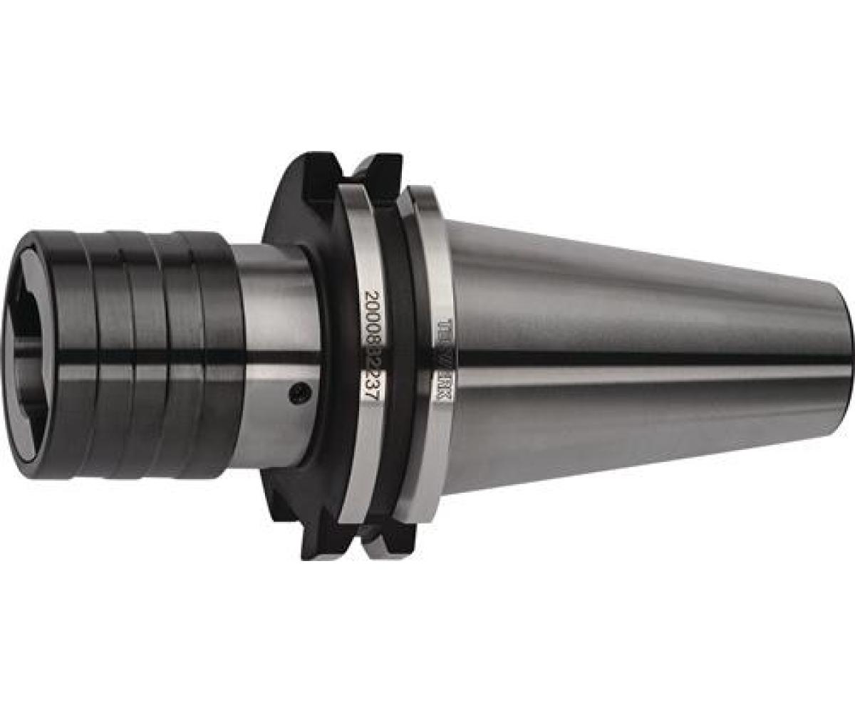 mit Steilkegel DIN 69871 Form A · mit Längenausgleich auf Druck und Zug · mit Kugelführungsbuchse · das Drehmoment des Gewindebohrers wird mittels Einspannen eines Schnellwechsel-Einsatzes übertragen