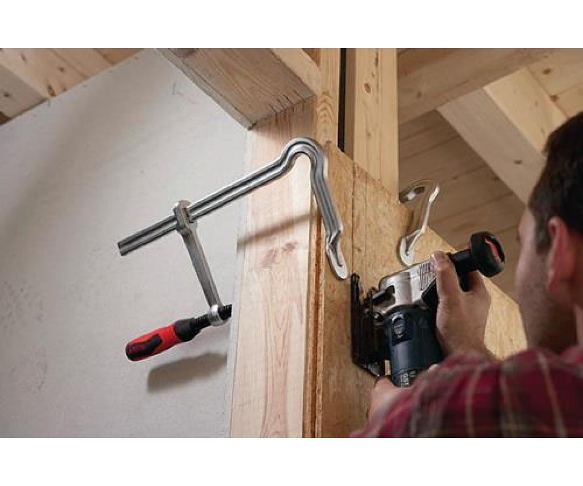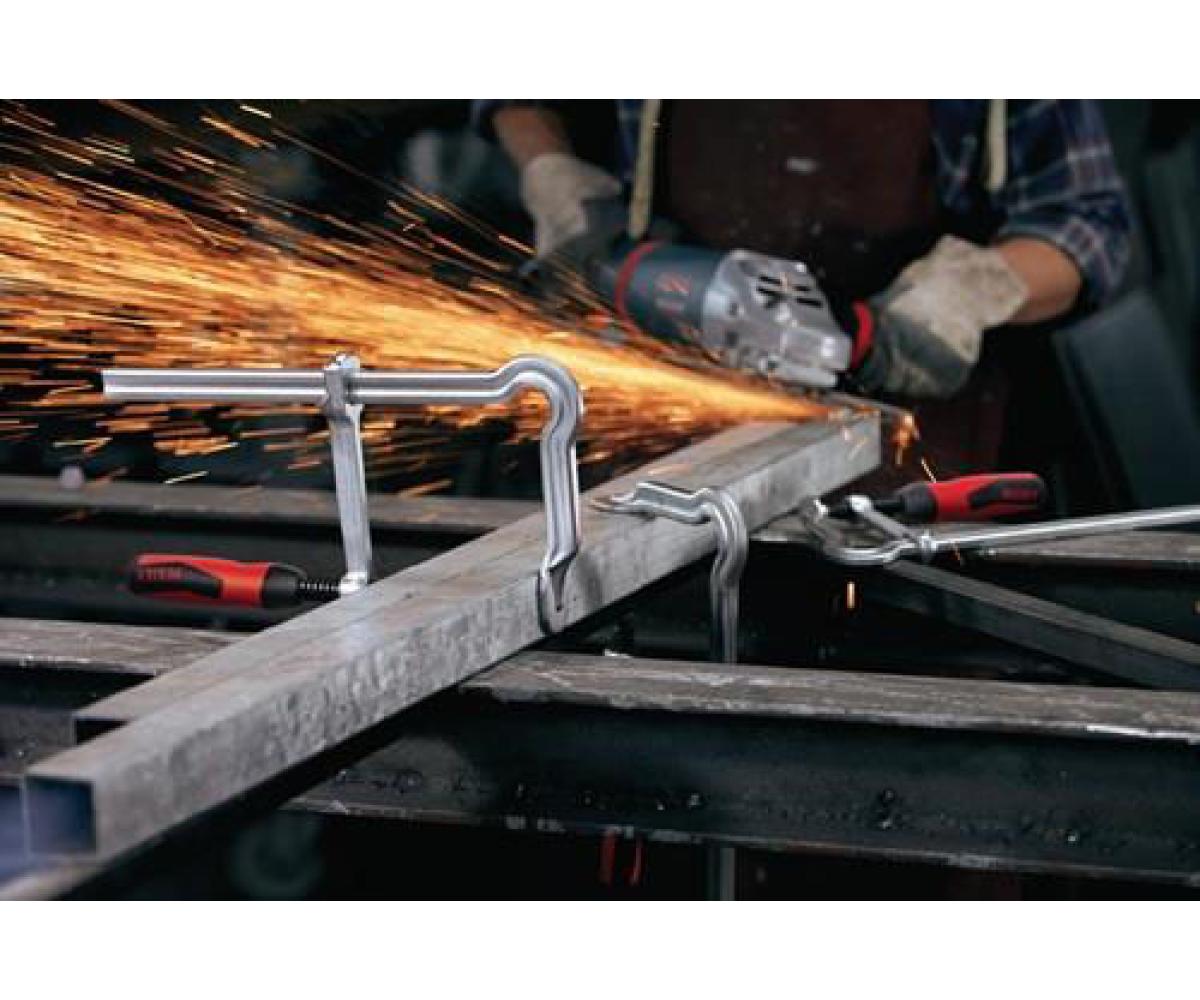 mit ergonomischem 2-Komponenten-Kunststoffgriff · wechselbare Druckplatte (werkzeuglos) · Schiene und Festbügel in einem Stück aus statisch optimiertem, kaltgezogenem Profilstahl · warmverformt, vergütet und galvanisch verzinkt · Gleitbügel aus Vergütungsstahl im Gesenk geschmiedet, vergütet und galvanisch verzinkt · Spindel mit leichtgängigem Trapezgewinde · Spannkraft bis zu 5000 N