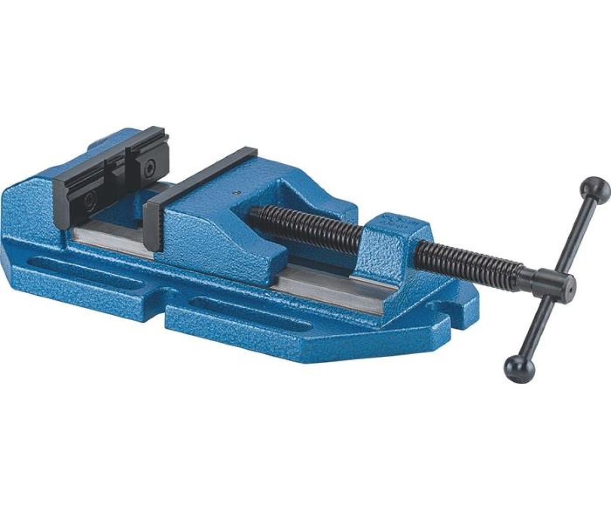 mit Gewindespindel · niedere stabile Ausführung · ganzer Spannbereich durch Drehen überbrückbar · Körper aus Spezialguss · Befestigung seitlich und stirnseitig · beide Backen mit Auflagefläche zum Spannen flacher Werkstücke · Spannbacken umkehrbar · eine Seite glatt bzw. Längs- und Querprismen · eine Seite gerillt