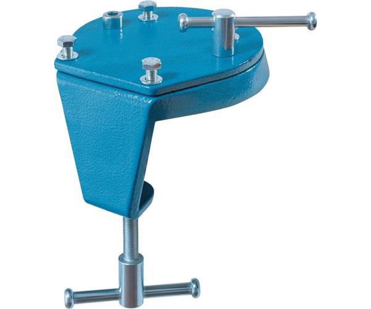 lässt sich mit wenigen Handgriffen – ohne Bohrungen von Löchern – einfach und schnell montieren und demontieren · kräftiger Spannhebel gewährleistet eine leichte und sichere Bedienung · der montierte Schraubstock ist um 360° drehbar · Führung ist vor Verschmutzung geschützt · 4 Schraubaufnahmen sind abgestimmt auf den HEUER Schraubstock 100 bzw. 120 · Made in Germany