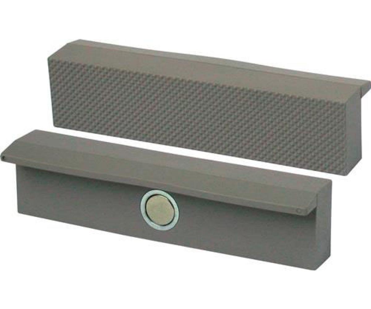 aus Polyurethan · zum Spannen von empfindlichen Werkstücken · mit äußerst kräftigem Neodym Flachmagnet, welcher fest in der Backe verpresst ist und sich auch nach langer Benutzung nicht löst · der Magnetismus dringt nicht zu der vorderen Spannfläche vor · passend für alle Schraubstocktypen