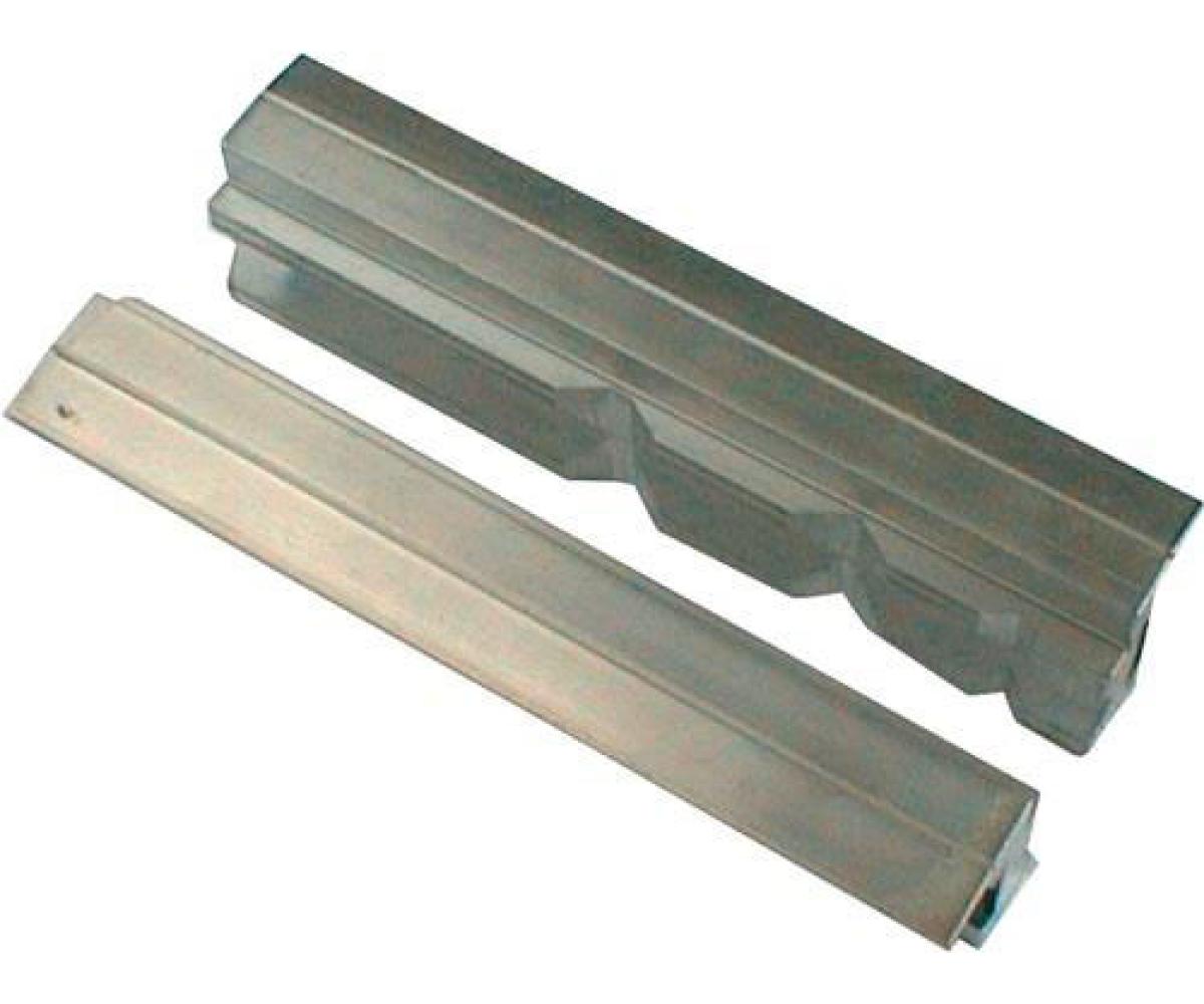 mit Prismen · mit Magnethalterung · kräftiges Alu-Profil eine Backe mit waagerechtem Prisma · die andere Seite mit drei unterschiedlichen senkrechten Prismen · eingearbeitete Magnetstreifen halten die Backen auf dem Schraubstock · die Legierung liegt in der Härte zwischen Kupfer und Blei VE = 1 Paar
