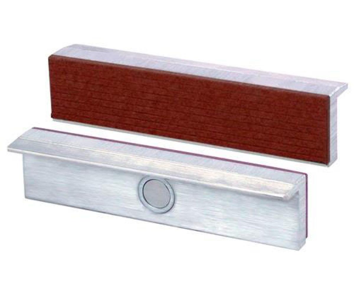 aus Aluminium mit Fiberbelag · zum Spannen von Werkstücken mit feingefrästen oder -gehobelten und geschliffenen oder polierten Flächen · mit äußerst kräftigem Neodym Flachmagnet, welcher fest in der Backe verpresst ist und sich auch nach langer Benutzung nicht löst · der Magnetismus dringt nicht zu der vorderen Spannfläche vor · passend für alle Schraubstocktypen