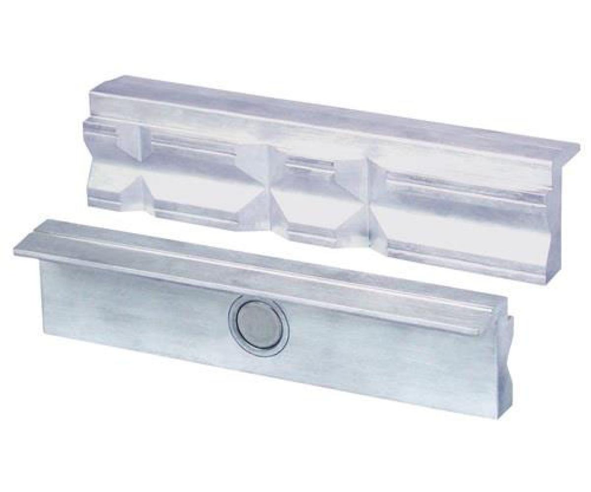 aus Aluminium mit Prismen · zum Spannen von Werkstücken in verschiedensten Formen · mit äußerst kräftigem Neodym Flachmagnet, welcher fest in der Backe verpresst ist und sich auch nach langer Benutzung nicht löst · der Magnetismus dringt nicht zu der vorderen Spannfläche vor · passend für alle Schraubstocktypen