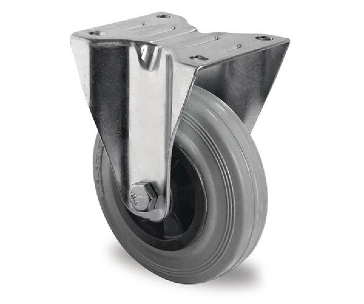 Transportgeräterolle · Radkörper: Polypropylen schwarz · Vollgummireifen grau 85° Shore A · Rollenlager · geräuscharm · mit Plattenbefestigung · für Indoor und Outdoor