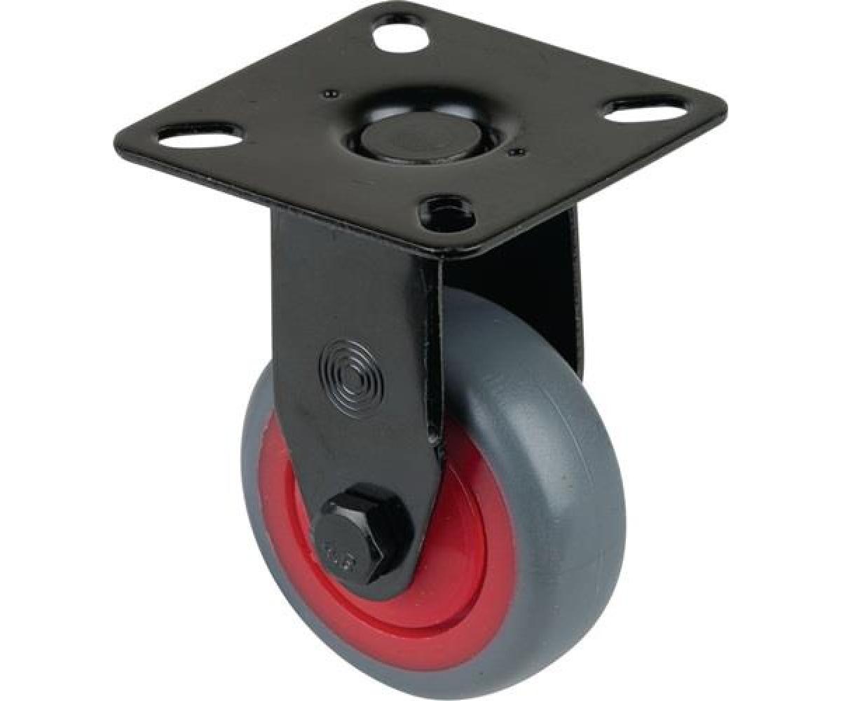 Apparaterolle · thermoplastisches Gummirad grau · Gabel aus Stahlblech, schwarz · zweireihiger Kugelkranz im Gabelkopf · Radkörper Kunststoff rot · Kugellager · mit Plattenbefestigung