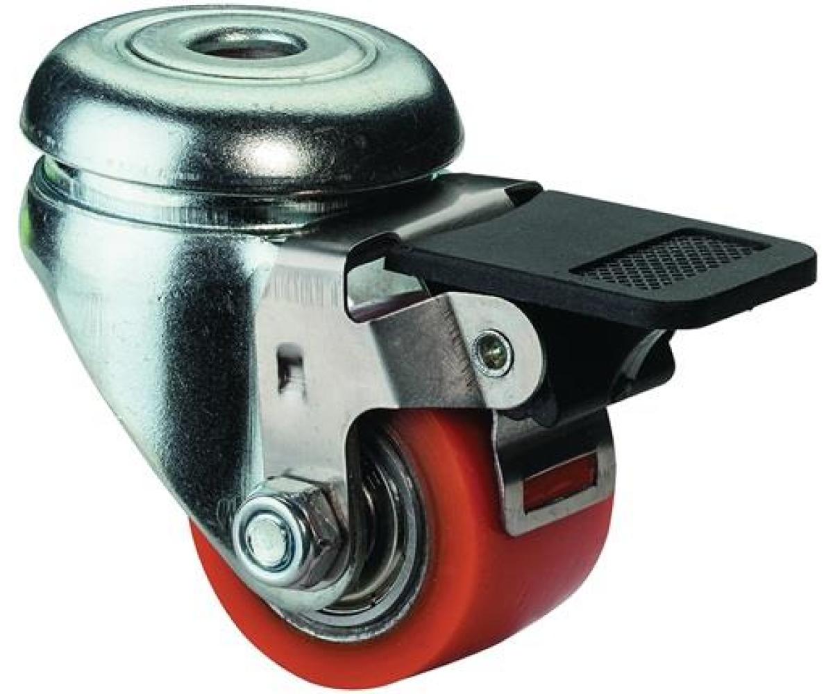 Gabel aus Stahlblech · zweireihiger Kugelkranz im Gabelkopf · Lauffläche Polyurethan 90+/-3 Shore A · niedrige Bauhöhe · hohe Tragkraft · Kugellager · sehr hoher Rollwiderstand und sehr hohe Verschleißbeständigkeit · mit Plattenbefestigung