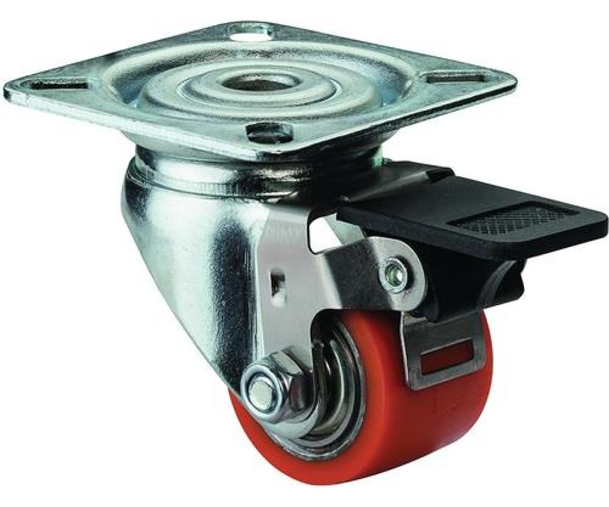 Gabel aus Stahlblech · zweireihiger Kugelkranz im Gabelkopf · Lauffläche Polyurethan 90+/-3 Shore A · niedrige Bauhöhe · hohe Tragkraft · Kugellager · sehr hoher Rollwiderstand und sehr hohe Verschleißbeständigkeit · mit Plattenbefestigung