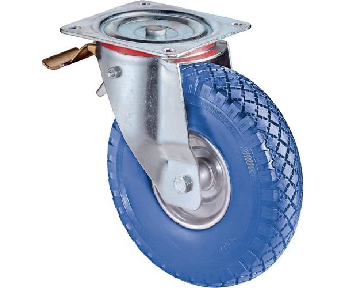 pannensicher · Gabel aus Stahlblech, verzinkt-chromatisiert, zweireihiger Kugelkranz im Gabelkopf · abriebfest, stoß- und geräuschdämpfend, wartungsfrei, nicht für Dauerbelastung geeignet · Polyurethanreifen · Radkörper Stahlfelge · alusilber pulverbeschichtet · Rollenlager · mit Plattenbefestigung