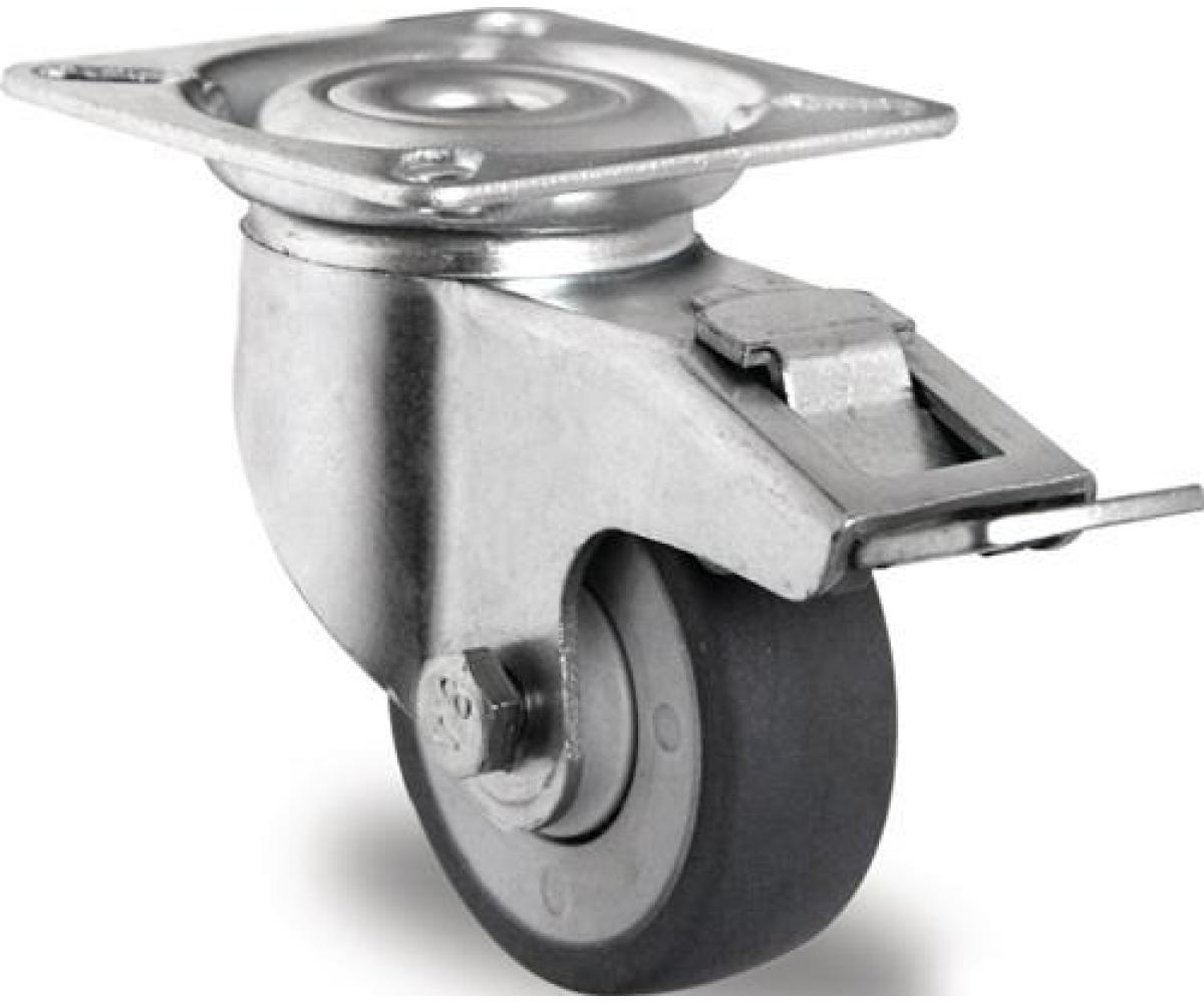 Apparaterolle · Gehäuse aus Stahlblech, galvanisch blau verzinktes Stahlblechgehäuse · korrosionsunempfindlich · zweireihiger Kugelkranz im Gabelkopf · thermoplastische Gummibereifung (grau) auf Kunststoff-Felge · Kugellager · mit Plattenbefestigung · Totalfeststeller aus Metall nachlaufend montiert