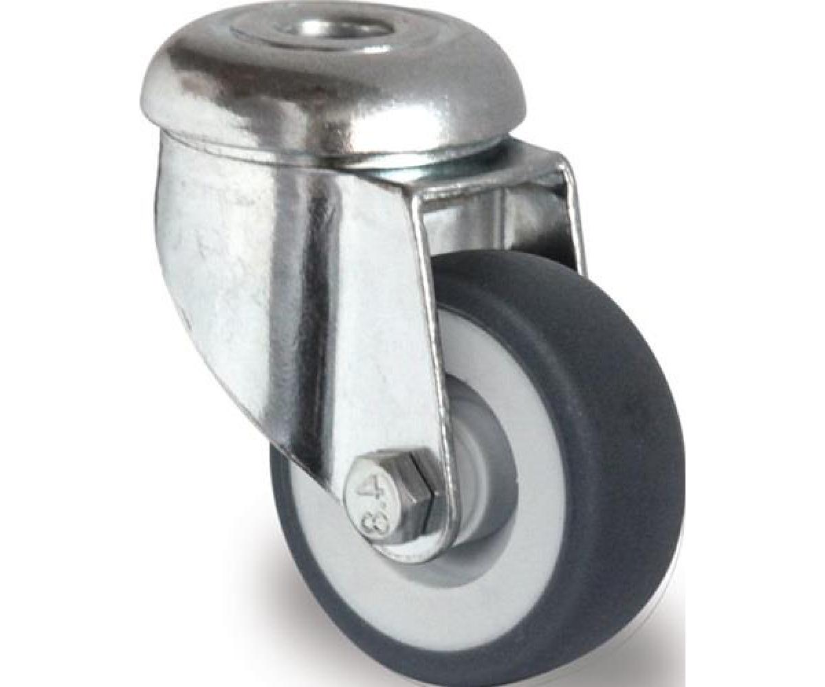 Apparaterolle · galvanisch blau verzinktes Stahlblechgehäuse · korrosionsunempfindlich · zweireihiger Kugelkranz im Gabelkopf · thermoplastische Gummibereifung (grau) auf Kunststoff-Felge · Gleitlager · Befestigung durch Rückenloch-Ø 11 mm