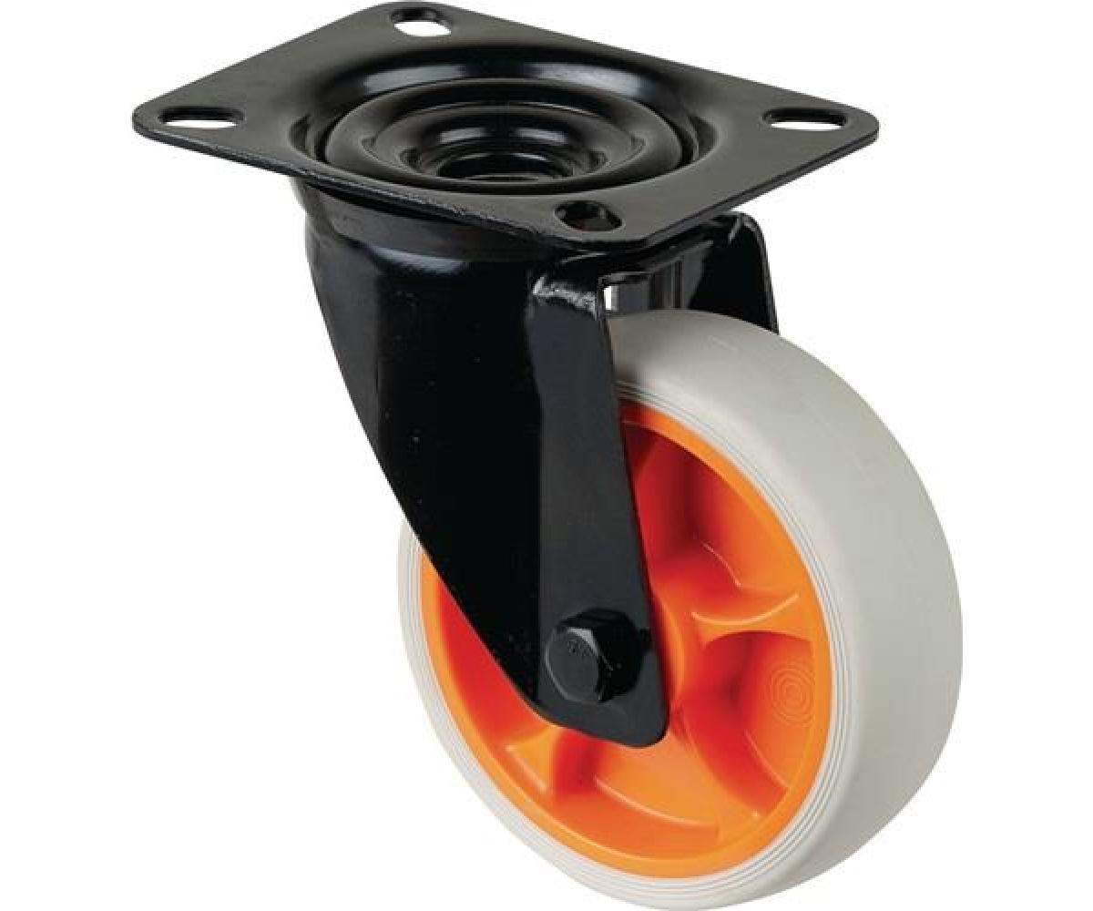 Transportrolle · Gehäuse aus Stahlblech, schwarz · zweireihiger Kugelkranz im Gabelkopf · thermoplastisches Gummirad hellgrau · Radkörper Kunststoff orange · Rollenlager · mit Plattenbefestigung