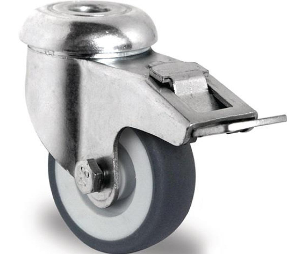 Apparaterolle · galvanisch blau verzinktes Stahlblechgehäuse · korrosionsunempfindlich · zweireihiger Kugelkranz im Gabelkopf · thermoplastische Gummibereifung (grau) auf Kunststoff-Felge · Gleitlager · Befestigung durch Rückenloch-Ø 11 mm · Totalfeststeller nachlaufend montiert