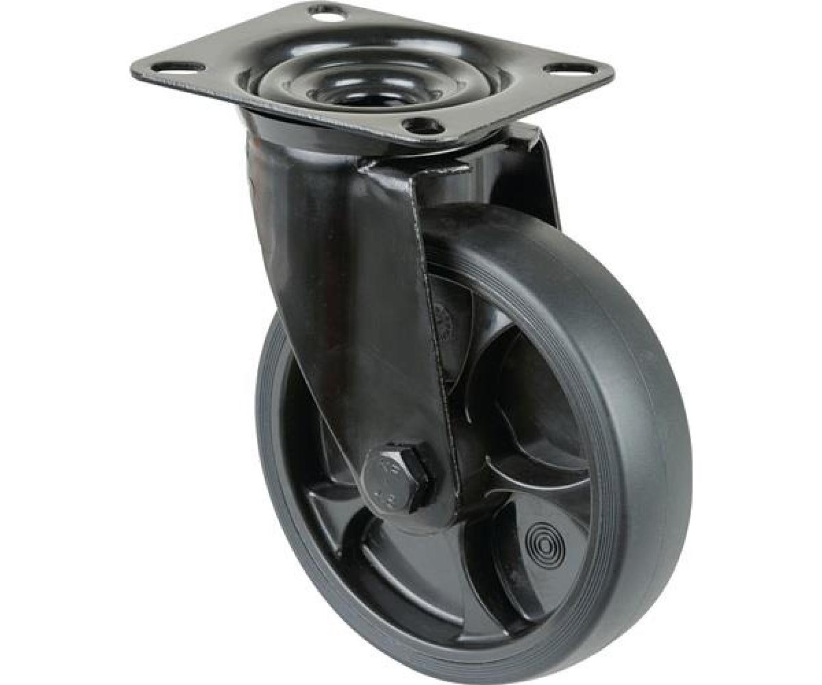 Transportrolle · Gehäuse aus Stahlblech, schwarz · Rollenlager · thermoplastisches Gummirad schwarz · zweireihiger Kugelkranz im Gabelkopf · Radkörper Kunststoff schwarz · mit Plattenbefestigung