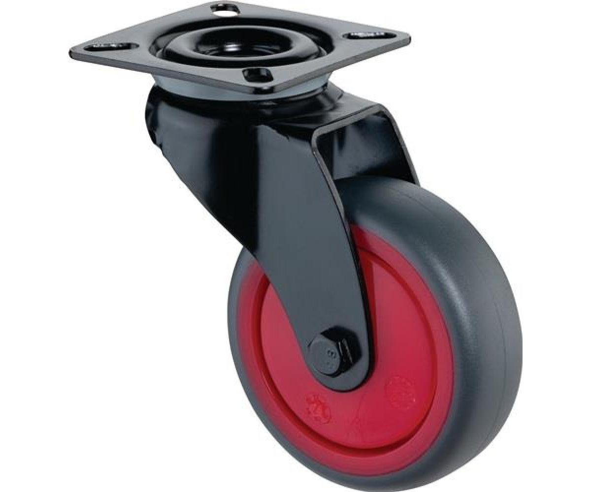 thermoplastisches Gummirad grau · Felge rot · Kugellager · Platte Gehäuse aus Stahlblech, schwarz · Kugellager · mit Plattenbefestigung