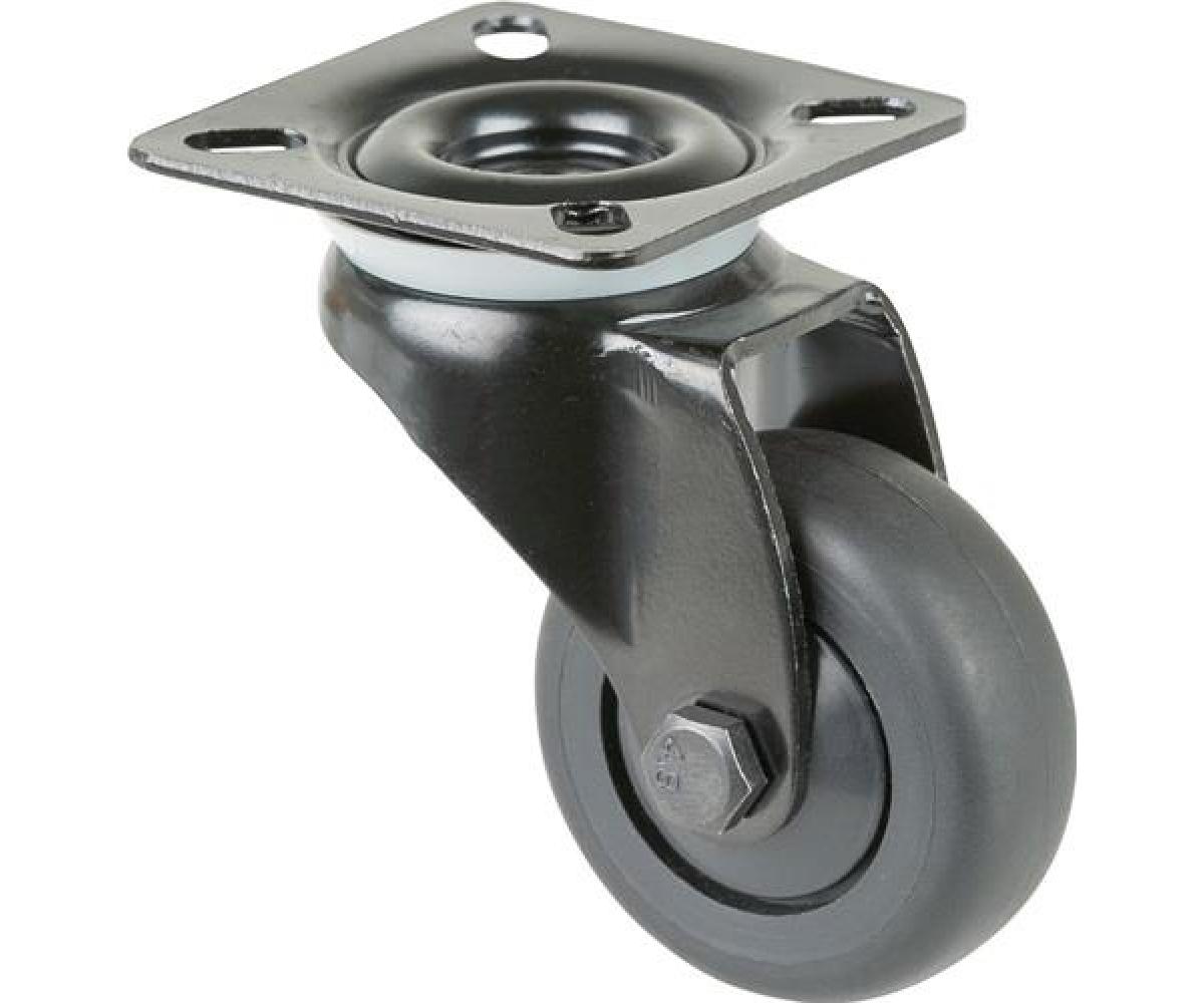 Apparaterolle · Gehäuse aus Stahlblech, schwarz · zweireihiger Kugelkranz im Gabelkopf · Radkörper Kunststoff schwarz · Kugellager · thermoplastisches Gummirad schwarz · sehr hoher Rollwiderstand · hohe Verschleißbeständigkeit · mit Plattenbefestigung