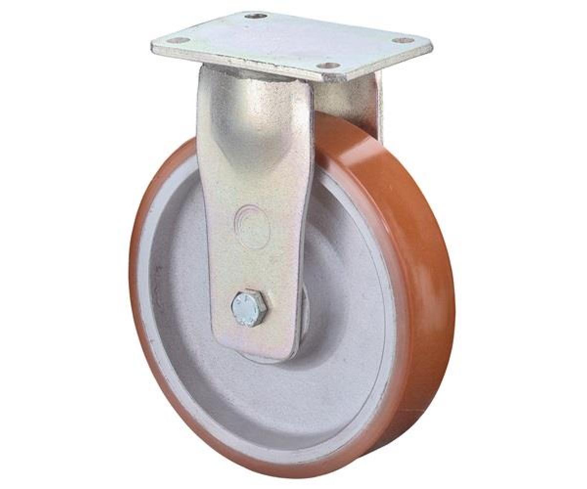 schwere Transportgeräterolle · schwere Stahlschweißkonstruktion · verzinkt · abriebfest · Rad: Polyurethan-Bandage (braun) auf Guss-Radkörper, 95 +/- 3 Shore A · beständig gegen Benzin, Diesel, Öle sowie pflanzliche und tierische Fette · Kugellager · mit Plattenbefestigung