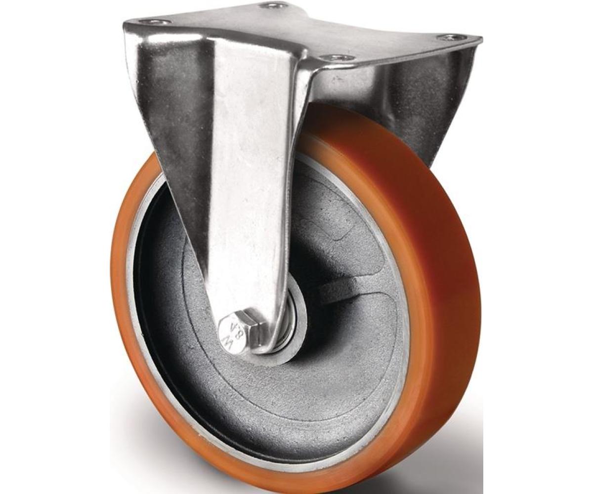 schwere Transportgeräterolle · schwere Stahlschweißkonstruktion · Bockrolle · verzinkt · abriebfest · Rad: Polyurethan-Bandage (braun) auf Guss-Radkörper, 95 +/- 3 Shore A · beständig gegen Benzin, Diesel, Öle sowie pflanzliche und tierische Fette · Kugellager · mit Plattenbefestigung