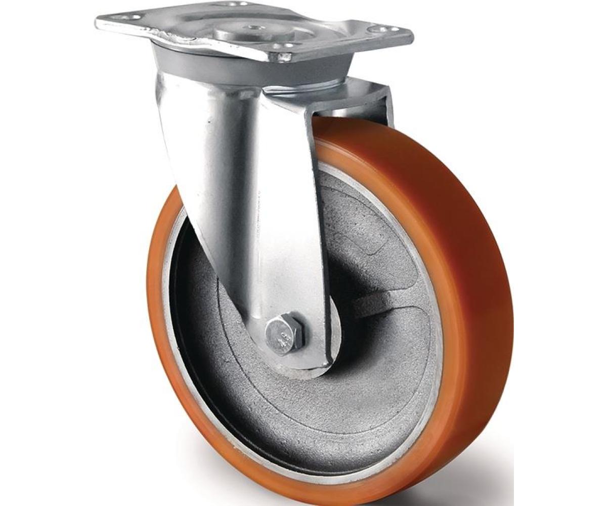 schwere Transportgeräterolle · schwere Stahlschweißkonstruktion · verzinkt · abriebfest · Rad: Polyurethan-Bandage (braun) auf Guss-Radkörper, 95 +/- 3 Shore A · beständig gegen Benzin, Diesel, Öle sowie pflanzliche und tierische Fette · Kugellager · mit Plattenbefestigung
