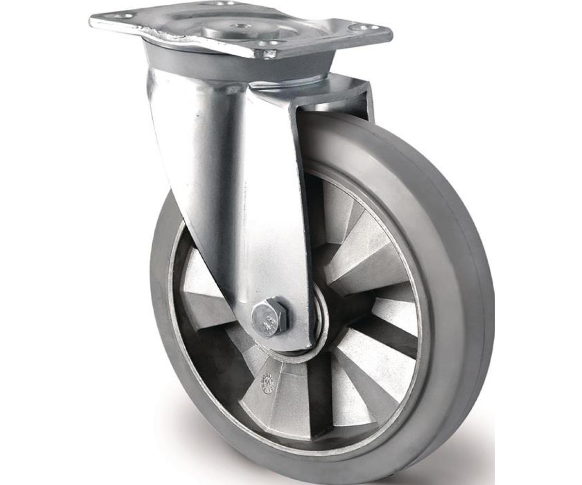 stabiles Stahlblechgehäuse, verzinkt chromatiert · zweireihiger Kugelkranz im Gabelkopf · Elastik-Vollgummireifen (grau, fest aufvulkanisiert) auf Aluminium-Radkörper · Radachse verschraubt · Kugellager · mit Plattenbefestigung