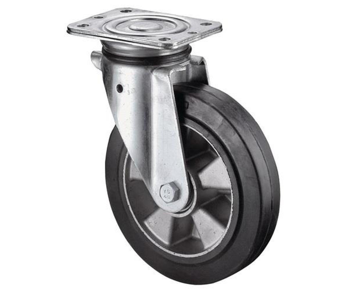 stabiles Stahlblechgehäuse, verzinkt chromatiert · zweireihiger Kugelkranz im Gabelkopf · Elastik-Vollgummireifen (schwarz, fest aufvulkanisiert) auf Aluminium-Radkörper · Radachse verschraubt · Kugellager · mit Plattenbefestigung