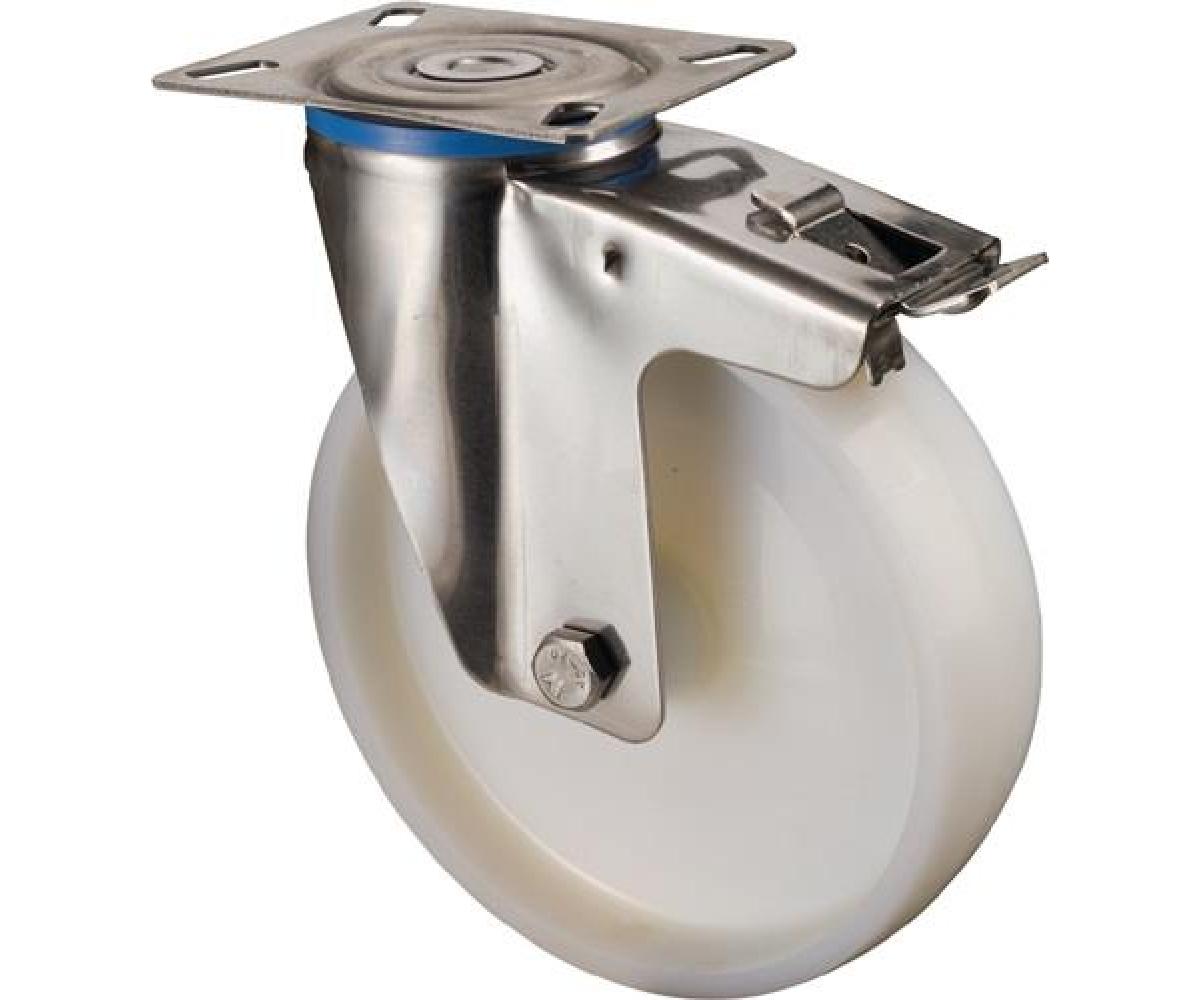 Transportrolle mit Totalfeststeller mit Edelstahlgehäuse · blockiert gleichzeitig Rad- und Schwenkbewegung, nachlaufend montiert · zweireihiger Kugelkranz im Gabelkopf · Rad Polyamid (weiß) · Gleitlager · Radachse verschraubt · mit Plattenbefestigung