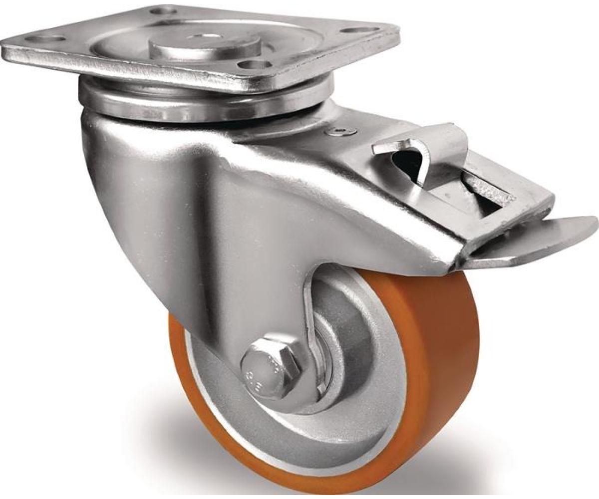 Transportrolle mit Totalfeststeller · Gabel aus Stahlblech · verzinkt-chromatiert · zweireihiger Kugelkranz im Gabelkopf · Lauffläche: Besothane Guss-Polyurethan 95 Shore · Alufelge · Kugellager · mit Plattenbefestigung · hohe Spurtreue · stabiler Transport von höheren Lasten