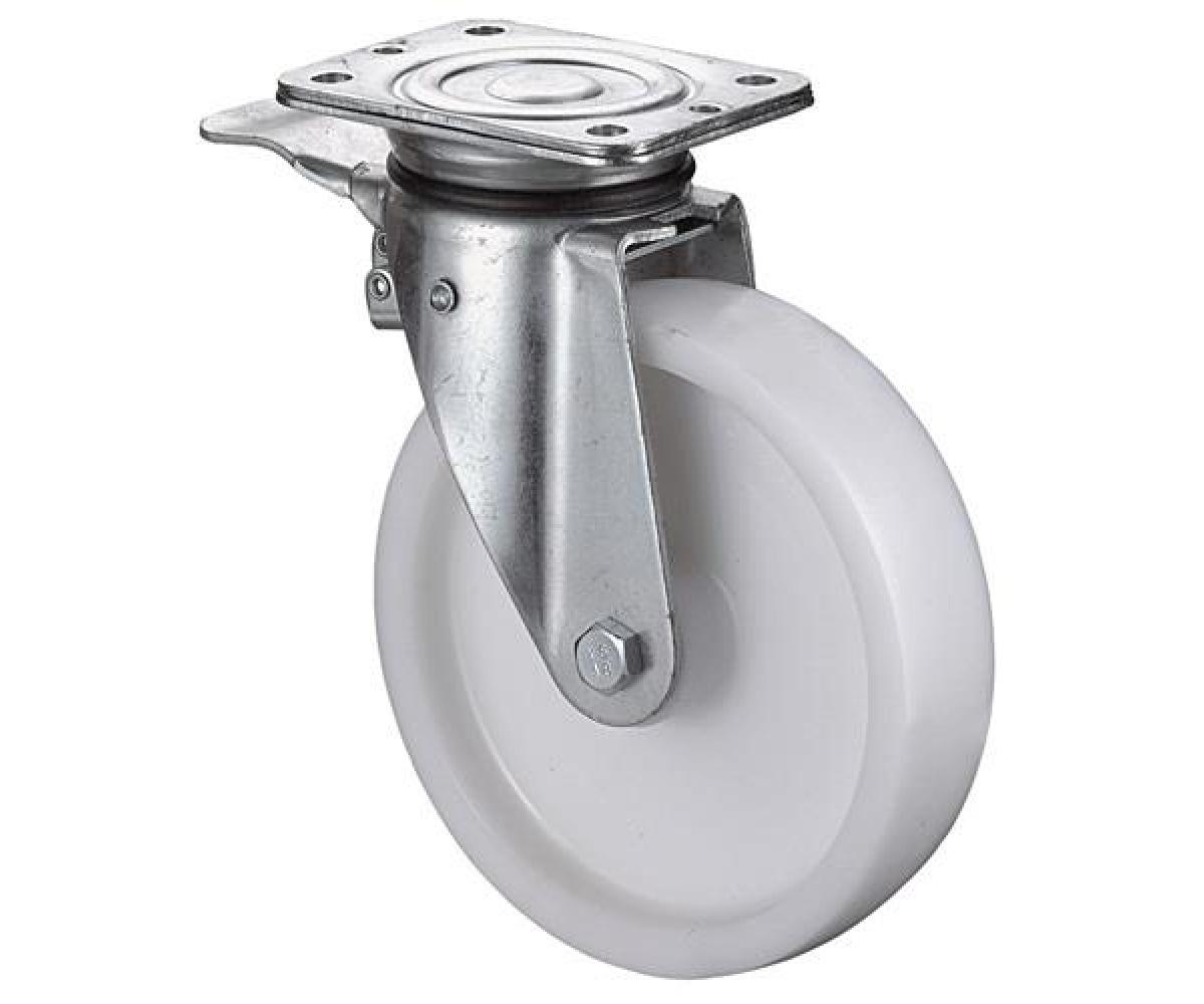 schwere Transportrolle mit Totalfeststeller · Stahlblechgehäuse, verzinkt-chromatiert · Radachse verschraubt · Rollenlager · Rad aus Kunststoff (naturfarben) · bruchsicher und sehr abriebfest · beständig gegen Bezin, Diesel, Öle sowie pflanzliche und tierische Fette · mit Plattenbefestigung