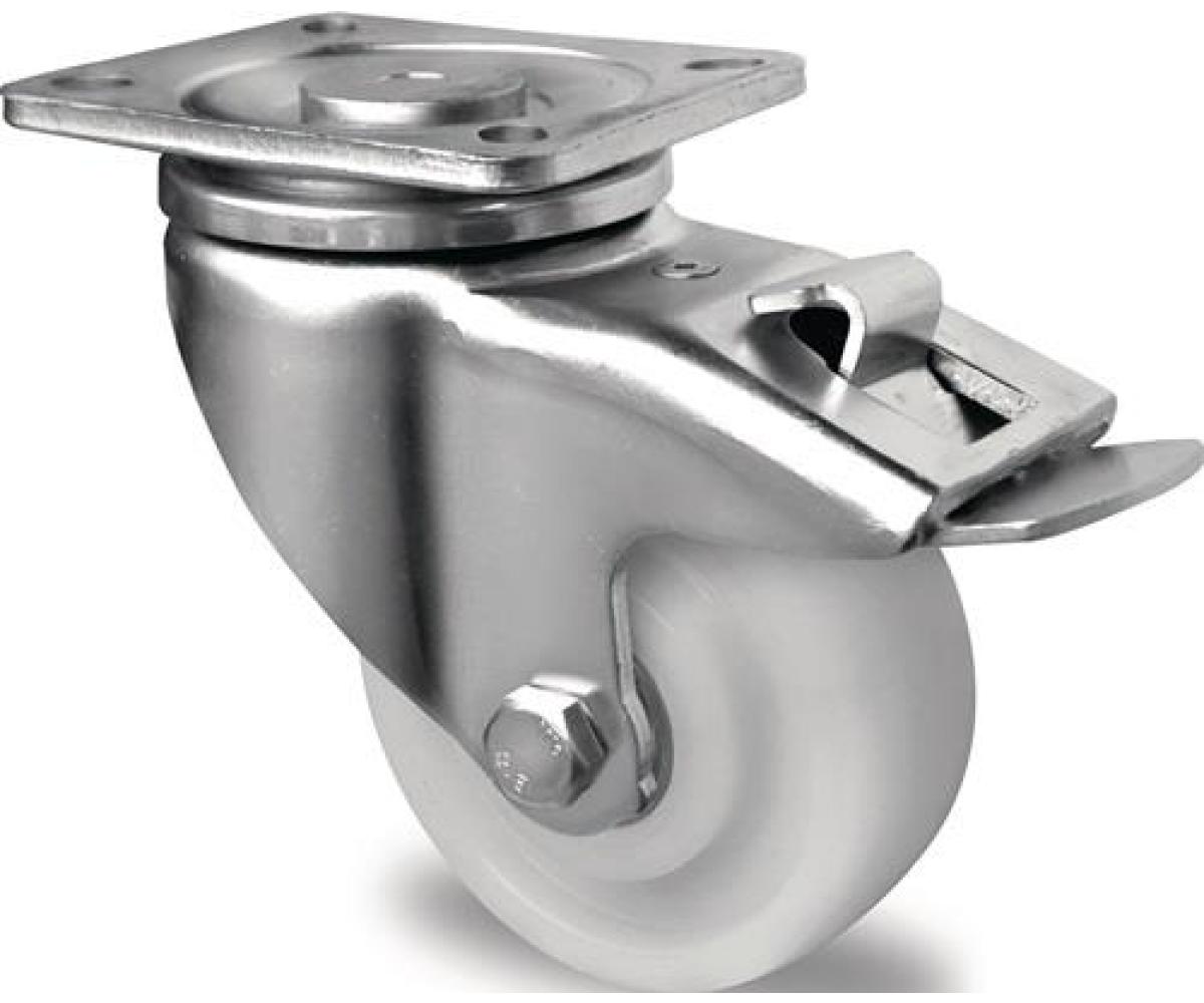 mit Totalfeststeller · galvanisch blau verzinktes Stahlblechgehäuse · Gehäuse mit Materialstärke 6 mm (Befestigung) und 5 mm (Gabel) · Radkörper aus Polyamid · Lauffläche Polyamid PA6 weiß · Doppelkugellager · verschraubte Radachse · mit Plattenbefestigung