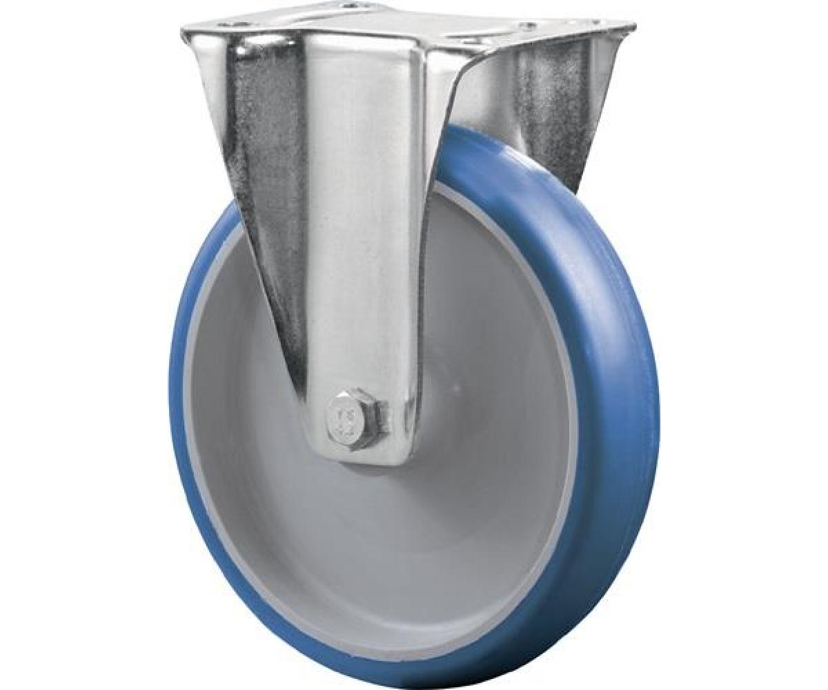 Transportrolle · Gabel aus Stahlblech, verzinkt-chromatiert · Rad: Lauffläche Polyurethan blau 85 +/-4 Shore A, Radkörper aus Kunststoff · Rollenlager · Radachse verschraubt · mit Plattenbefestigung