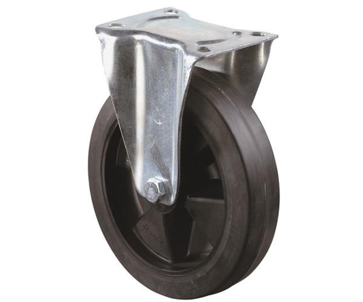 Transportrolle · Gehäuse aus Stahlblech, verzinkt-chromatiert · Radachse verschraubt · Rollenlager · Elastik-Vollgummireifen (schwarz, fest aufvulkanisiert), auf Polyamid-Radkörper (schwarz) · bodenschonend - extrem abriebfest · mit Plattenbefestigung