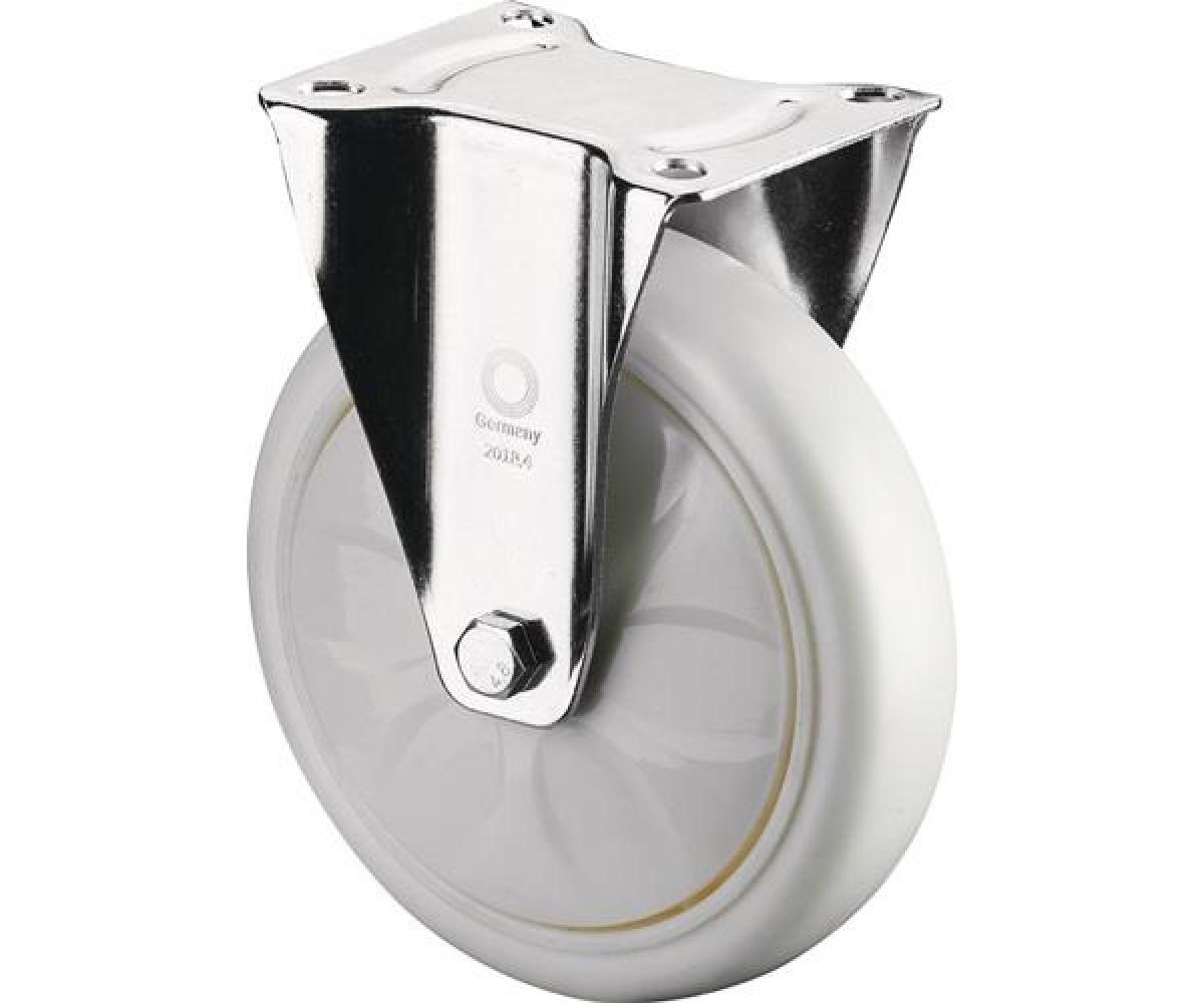 Transportrolle · Kunststoffrad · schmutz- und spritzwassergeschützt durch den integrierten Fadenschutz · konische Ablenkscheiben verhindern das Ausbremsen der Räder durch Fäden oder ähnliche Fremdstoffe · Kugellager · Gabel aus Stahlblech zweireihiger Kugelkranz im Gabelkopf · mit Plattenbefestigung