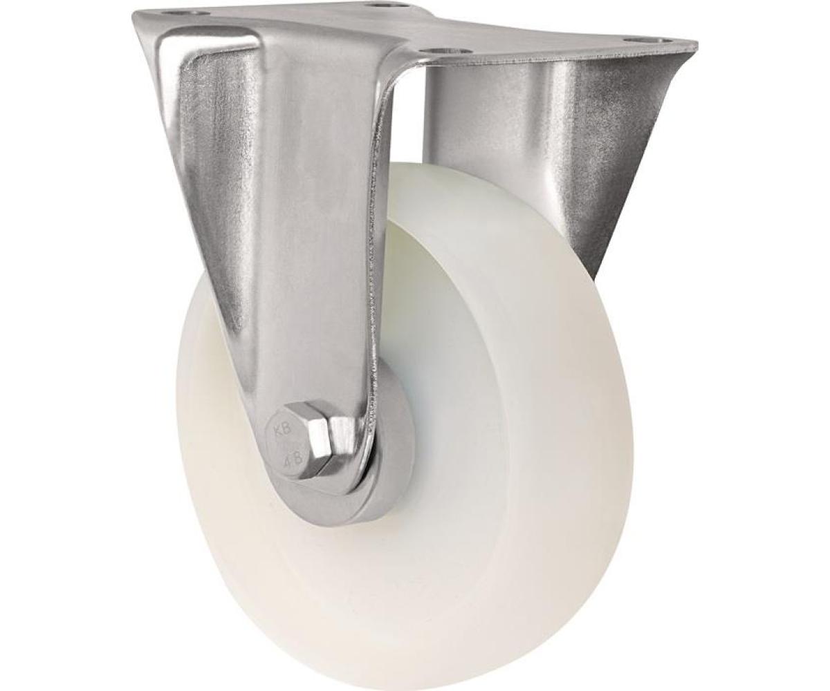 Transportgeräterolle · galvanisch blau verzinktes Stahlblechgehäuse · Radachse verschraubt · Rollenlager · Rad aus Polyamid, weiß, mit kleinem Metallfadenschutz, witterungsbeständig, beständig gegen viele Öle und Chemikalien · mit Plattenbefestigung