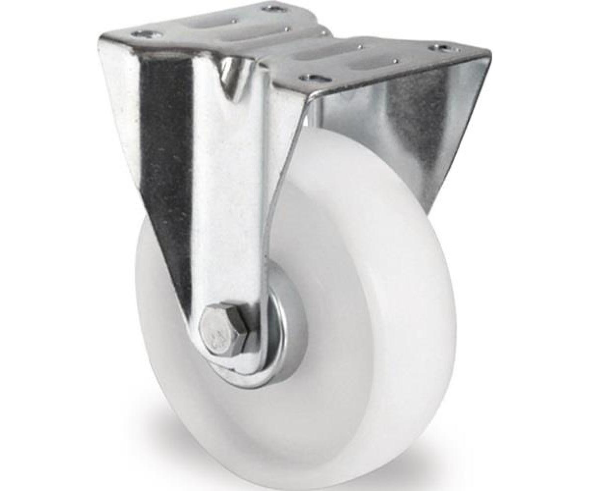 Transportgeräterolle · galvanisch blau verzinktes Stahlblechgehäuse · Radachse verschraubt · Rollenlager · Rad aus Polyamid, weiß, mit kleinem Metallfadenschutz, witterungsbeständig, beständig gegen viele Öle und Chemikalien · mit Plattenbefestigung