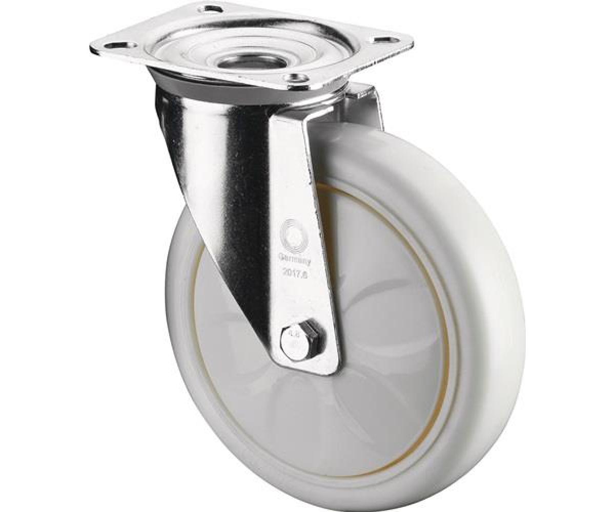 Transportrolle · Kunststoffrad · schmutz- und spritzwassergeschützt durch den integrierten Fadenschutz · konische Ablenkscheiben verhindern das Ausbremsen der Räder durch Fäden oder ähnliche Fremdstoffe · Kugellager · Gabel aus Stahlblech · zweireihiger Kugelkranz im Gabelkopf · mit Plattenbefestigung